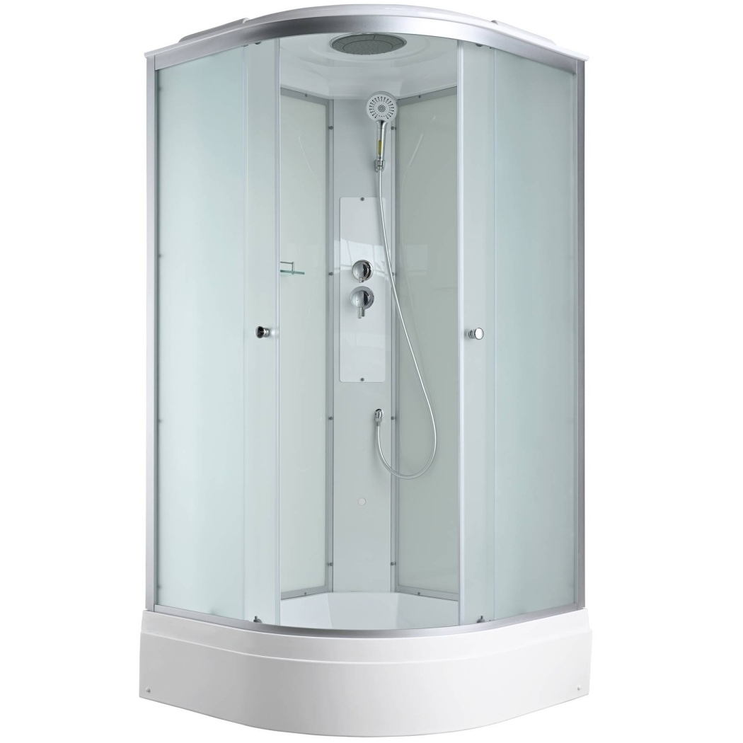 Стильная душевая кабина сочетает в себе высокую функциональность, практичность и надежность. При изготовлении применяется безопасное закаленное стекло толщиной 4 мм (матовое), надежно фиксируемое алюминиевым профилем. Сборка без силикона (увеличивает срок службы), внутренняя сборка (облегчает установку и ревизию, позволяет установить душевую кабину в ограниченном пространстве),смеситель резьбовой (без хомутов), съемный экран поддона (позволяет осуществлять ревизию сифона), цвет профиля матовый хром. Двойные металлические ролики дверей (увеличивают срок службы).В комплекте: полочка, тропический (верхний) душ, арома-лейка с витамином С (картридж съемный).