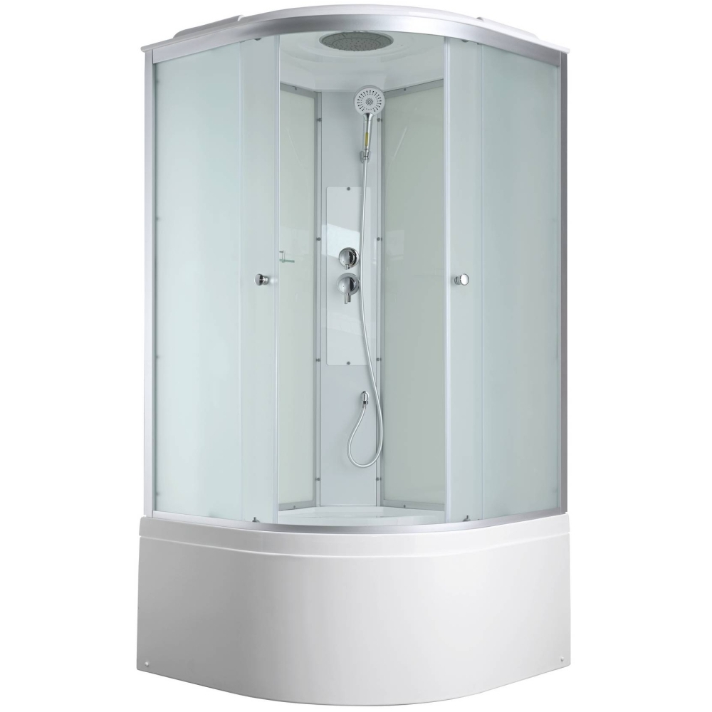 Стильная душевая кабина сочетает в себе высокую функциональность, практичность и надежность. При изготовлении применяется безопасное закаленное стекло толщиной 4 мм (матовое), надежно фиксируемое алюминиевым профилем. Сборка без силикона (увеличивает срок службы), внутренняя сборка (облегчает установку и ревизию, позволяет установить душевую кабину в ограниченном пространстве),смеситель резьбовой (без хомутов), съемный экран поддона (позволяет осуществлять ревизию сифона), цвет профиля матовый хром. Двойные металлические ролики дверей (увеличивают срок службы).В комплекте: полочка, тропический (верхний) душ, арома-лейка с витамином С (картридж съемный).