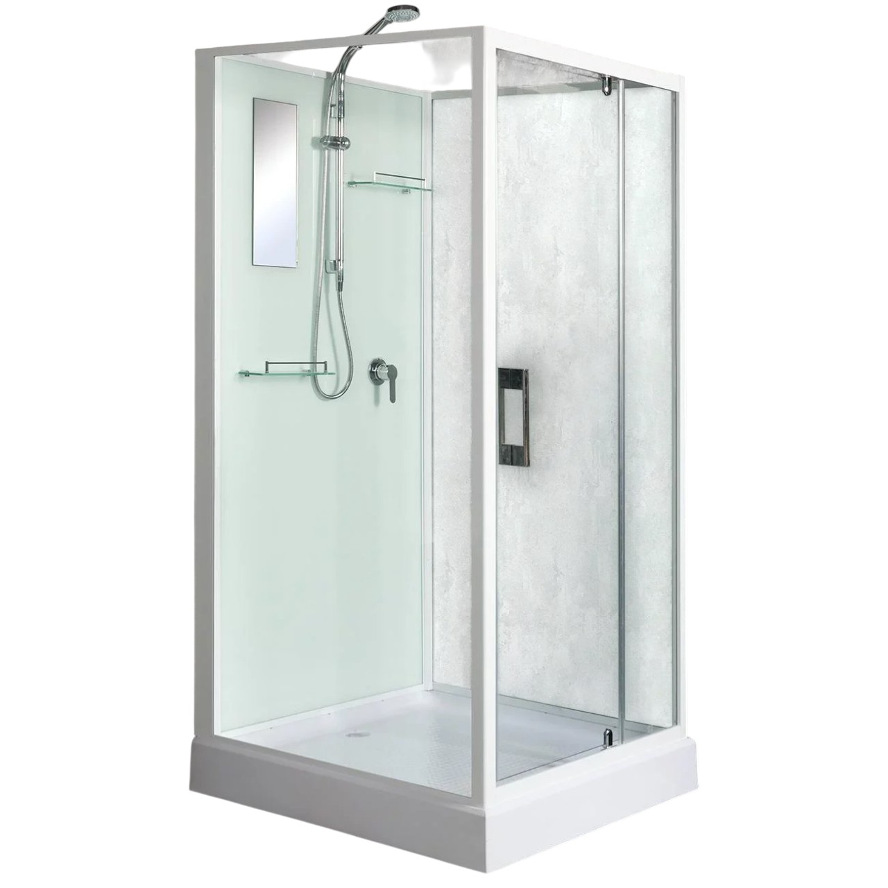 Квадратная душевая кабина для пристенного монтажа. Закалённое травмобезопасное стекло 6 мм. Акриловый поддон армированный стекловолокном на регулируемых ножках. Распашная дверь. В комплекте: ручной душ 3-х режимный, штанга, смеситель из латуни с керамическим картриджем, полочка 2 шт, зеркало, поддон, сифон с гидрозатвором.