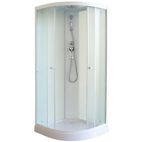 Стекла: закаленные, матовые, толщиной 4 мм. Заднее стекло прозрачное, рифленое, белое. Профиль: белый, алюминиевый. Поддон армированный 10 см. Магнитные уплотнители под 45°. Соединение без болтовое. Дополнительные силиконовые уплотнители для задних стенок. Монтаж без силикона. Комплектация: смеситель, верхний душ, ручной душ, сифон.