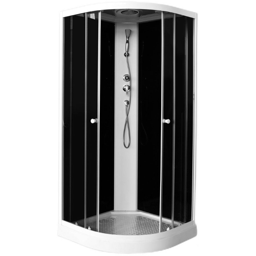 Поддон и крыша белые из ABS-пластика. Профиль - белый алюминиевый. Центральная панель — из пластмассы. Передние стекла — закаленные, тонированные, толщиной 4 мм. Задние стекла — закаленные, черные, толщиной 4 мм. Ролики — белые одинарные. Дополнительная ножка на каркасе. Уплотнители дверей — магнитные, пластиковые под 45 градусов, белого цвета. Боковой профиль из анодированного алюминия. Без болтовое соединение задних стекол. Бортик на поддоне. Комплектация: смеситель, верхний душ, ручной душ, одинарные ручки, сифон.