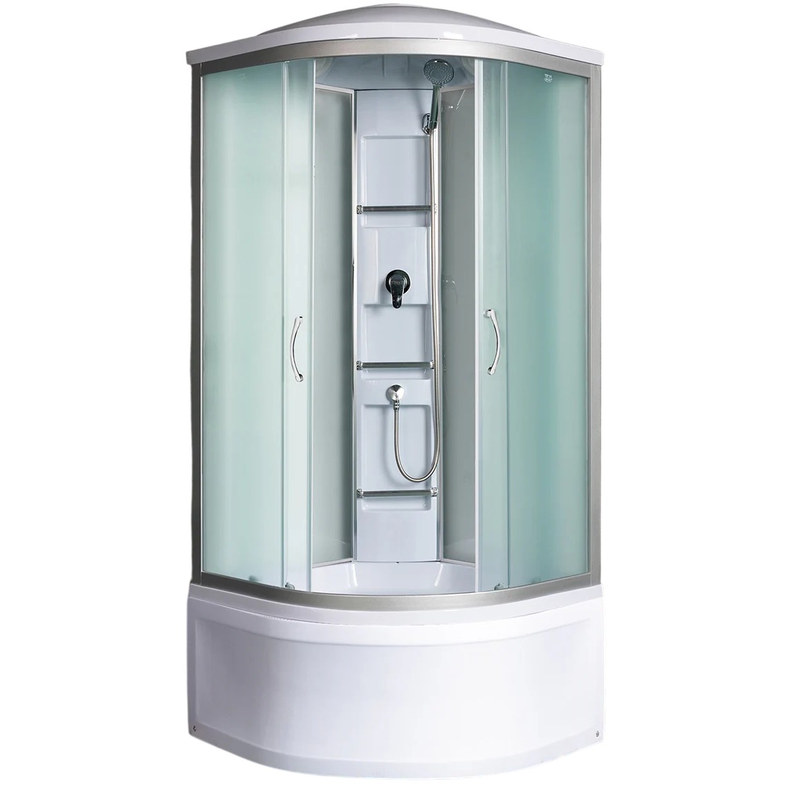 Полукруглая душевая кабина c 2 раздвижными дверями. Матовые передние стекла. Белые задние стеклянные стенки. Высокий акриловый поддон со съемным экраном и антискользящим покрытием дня. Алюминиевый профиль хром матовый. Комплектация: крыша, сифон с гидрозатвором, полочка, тропический душ, ручной душ. Безсиликоновая сборка.