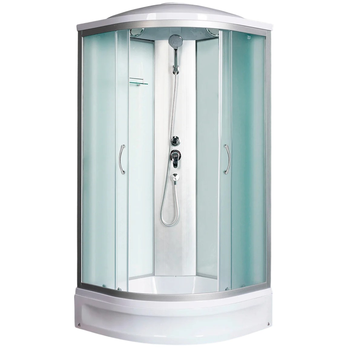Полукруглая душевая кабина. Закаленное безопасное стекло толщиной 4 мм. Матовые передние стекла. Белые задние стеклянные стенки. Средний акриловый поддон со съемным экраном и антискользящим покрытием дня. Алюминиевый профиль хром матовый. Комплектация: крыша, верхний душ металлический Easy Clean, ручной душ 3 режима, штанга, смеситель из латуни с керамическим картриджем, полочка, центральная стойка, сифон с гидрозатвором.
