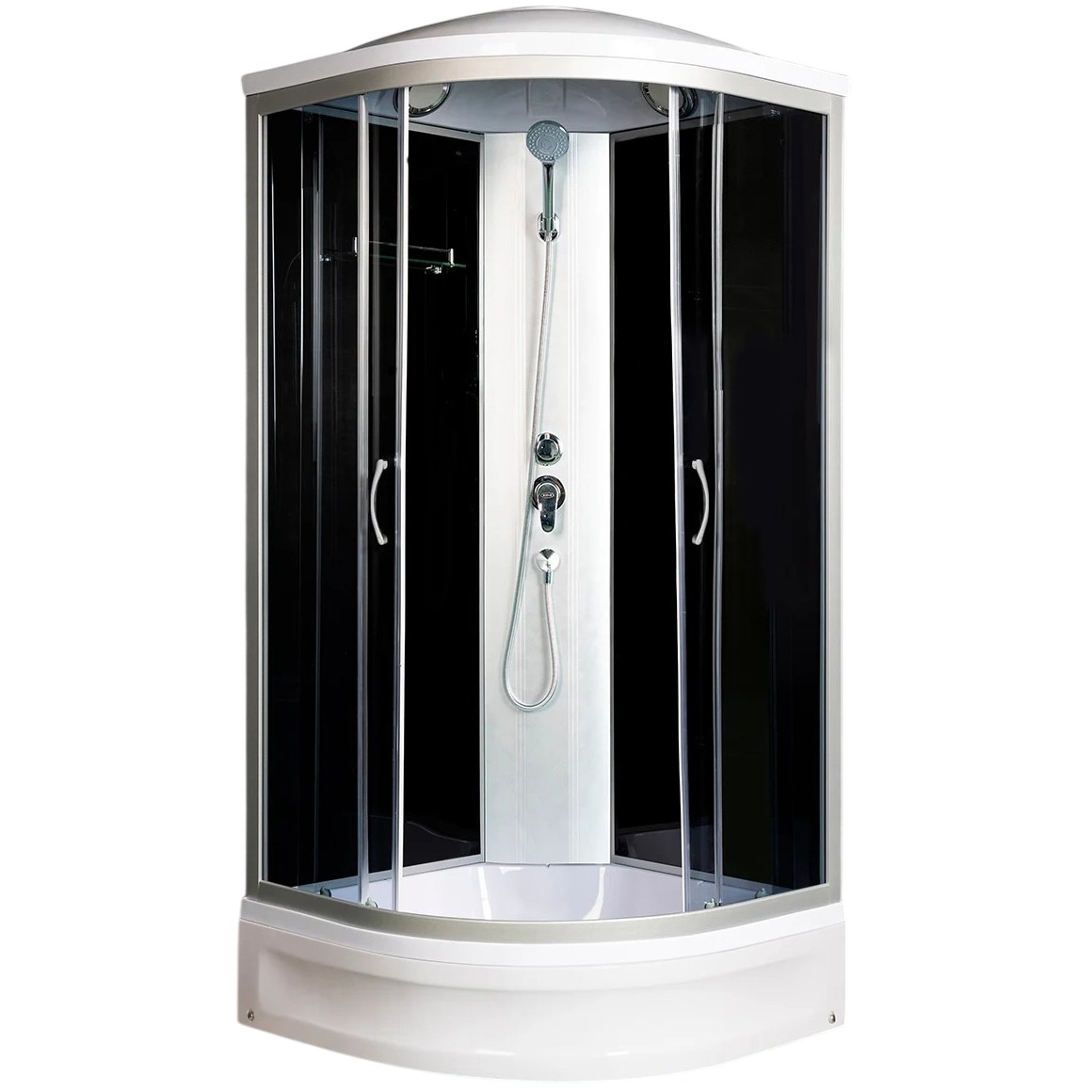 Полукруглая душевая кабина. Закаленное безопасное стекло толщиной 4 мм. Тонированные передние стекла. Черные задние стеклянные стенки. Средний акриловый поддон со съемным экраном и антискользящим покрытием дня. Алюминиевый профиль хром матовый. Комплектация: крыша, верхний душ металлический Easy Clean, ручной душ 3 режима, штанга, смеситель из латуни с керамическим картриджем, полочка, центральная стойка, сифон с гидрозатвором.