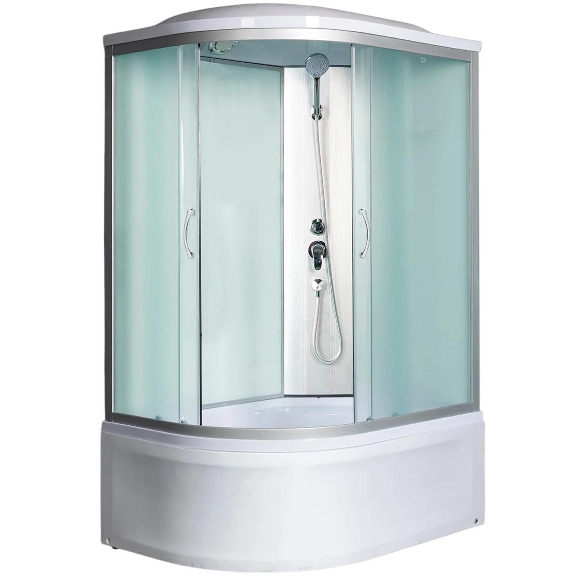 Асиметричная душевая кабина. Закаленное безопасное стекло толщиной 4 мм. Матовые передние стекла. Белые задние стеклянные стенки. Высокий акриловый поддон со съемным экраном и антискользящим покрытием дня. Алюминиевый профиль хром матовый. Комплектация: крыша, верхний душ металлический Easy Clean, ручной душ, штанга, смеситель из латуни с керамическим картриджем, полочка, центральная стойка, сифон с гидрозатвором.