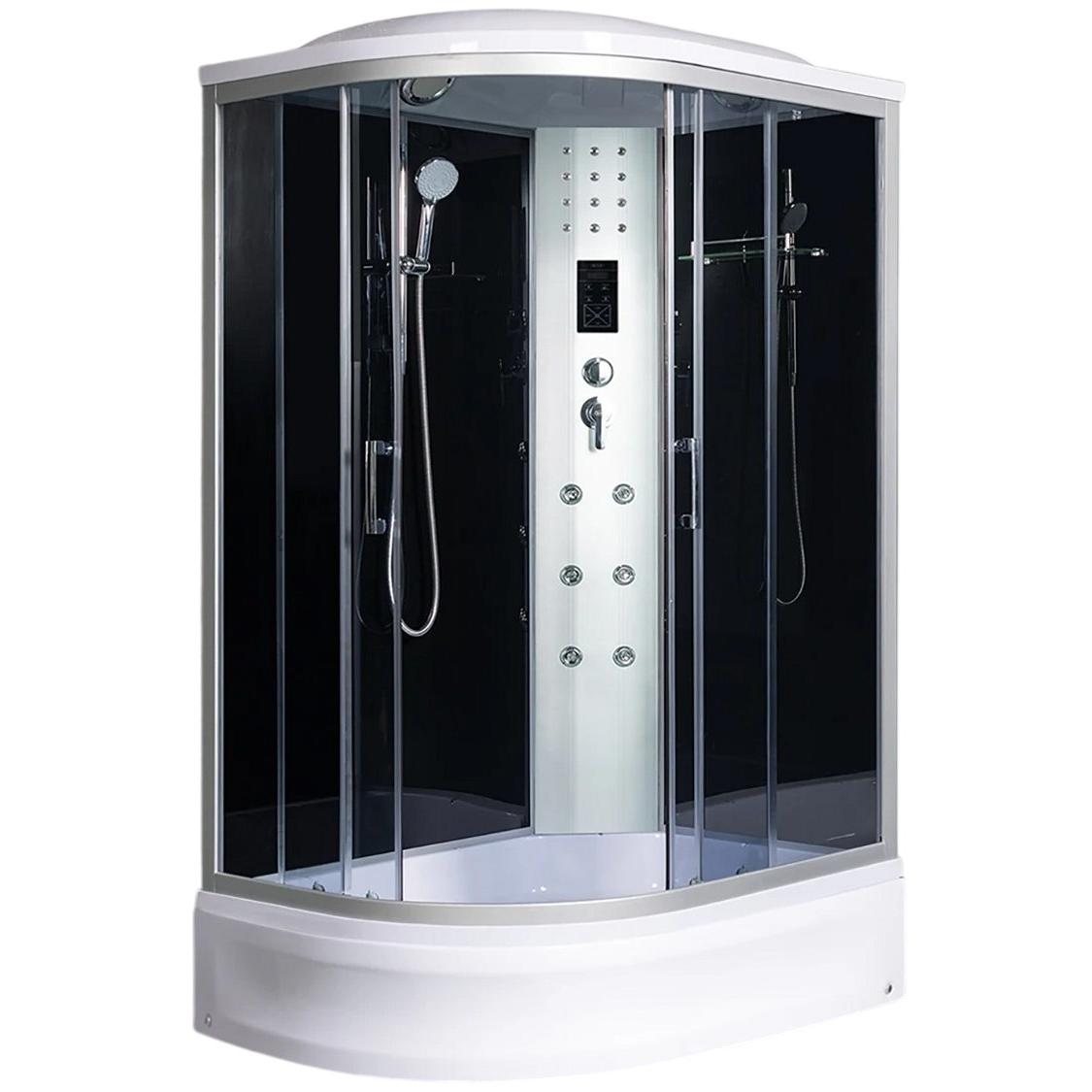 Асимметричная душевая кабина с 2 раздвижными дверями. Тонированные передние стекла. Черные задние стеклянные стенки. 6 форсунок гидромассажа. Средний акриловый поддон со съемным экраном и антискользящим покрытием дня. Алюминиевый профиль хром матовый. Комплектация: крыша, сифон с гидрозатвором, верхний свет, подсветка "лунный свет", полочка, радио, динамики, сенсорный пульт управления, тропический душ, ручной душ, вентиляция.