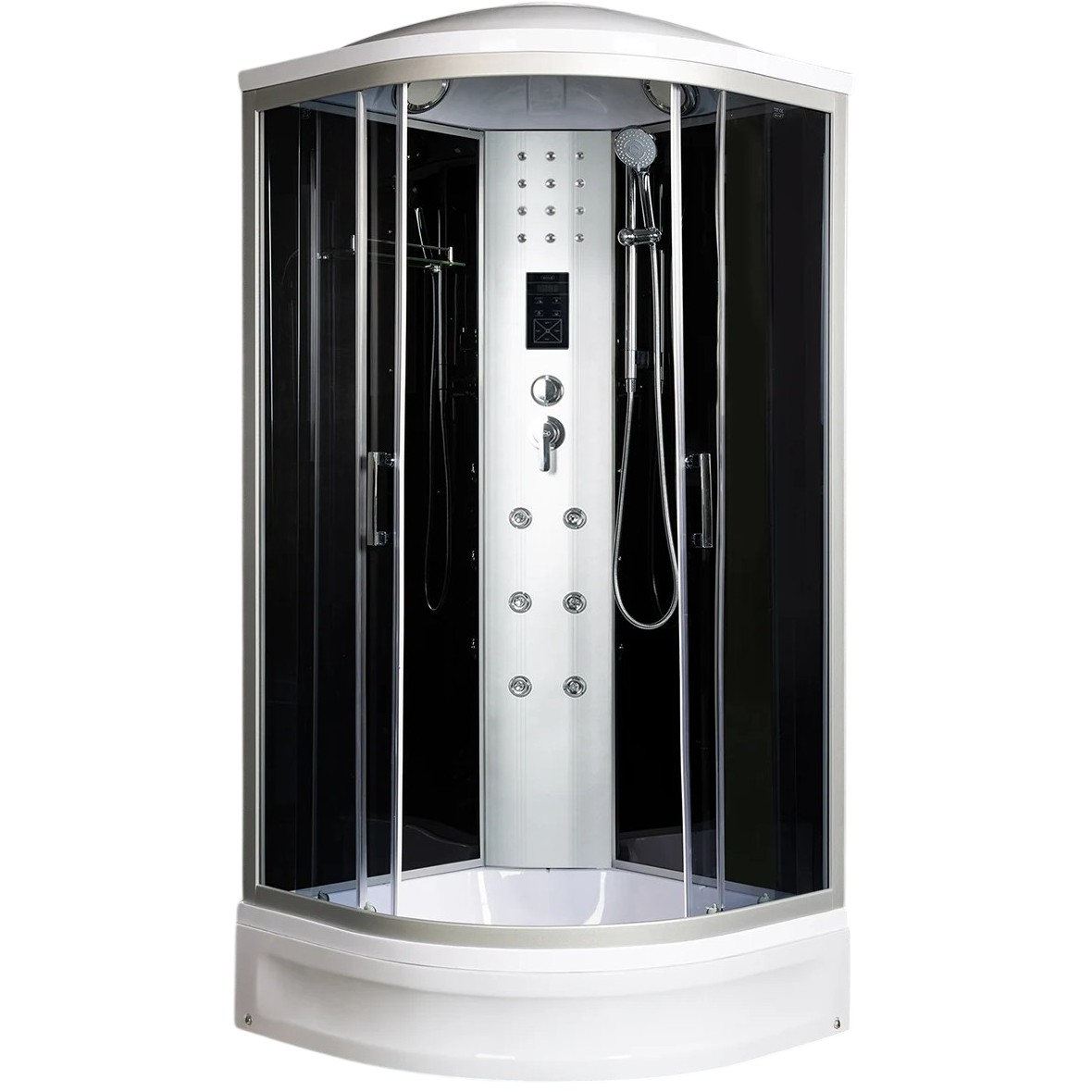 Полукруглая душевая кабина с 2 раздвижными дверями. Тонированные передние стекла. Черные задние стеклянные стенки. 6 форсунок гидромассажа. Средний акриловый поддон со съемным экраном и антискользящим покрытием дня. Алюминиевый профиль хром матовый. Комплектация: сифон с гидрозатвором, верхний свет, подсветка "лунный свет", полочка, радио, динамики, сенсорный пульт управления, тропический душ, ручной душ, вентиляция.