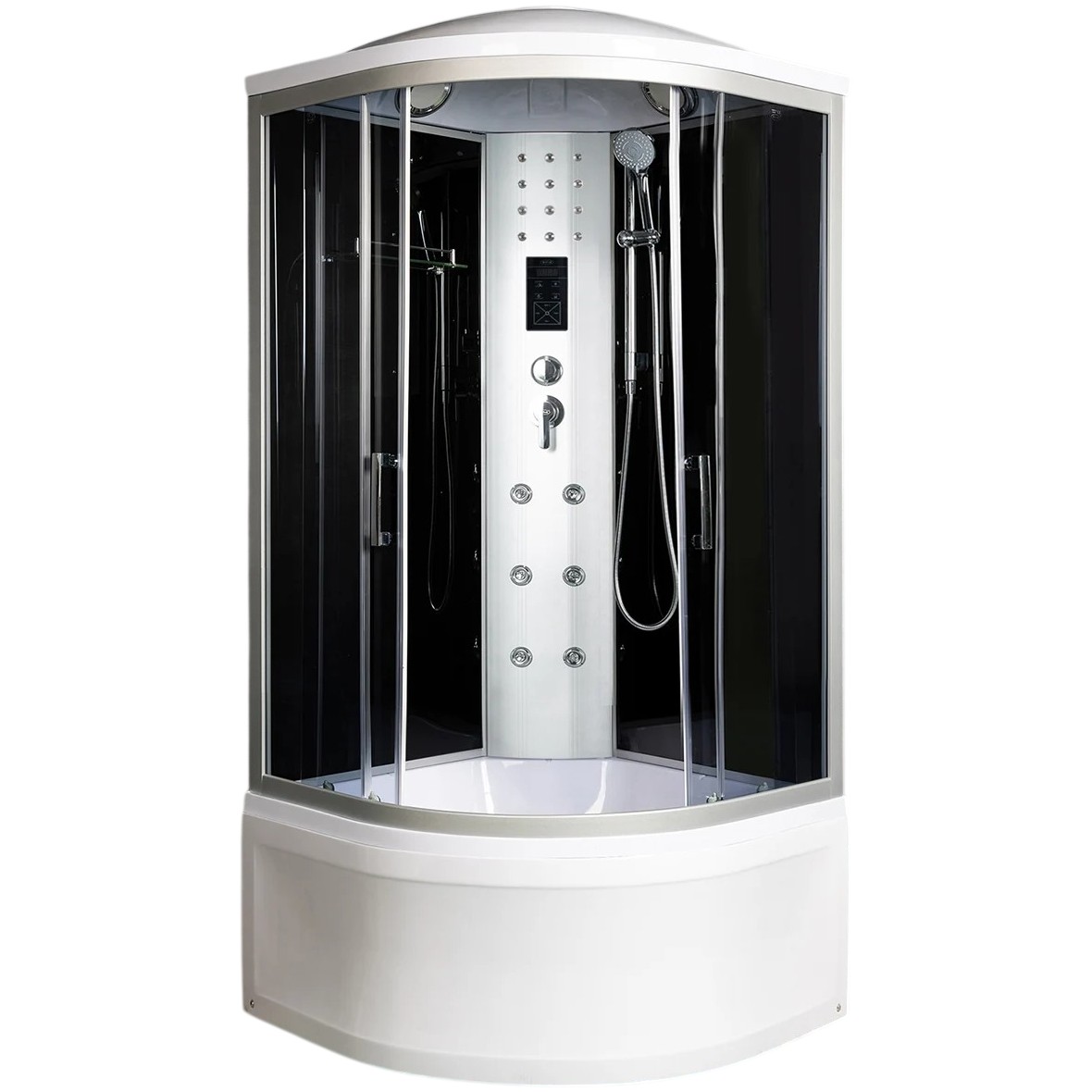 Полукруглая душевая кабина с 2 раздвижными дверями. Тонированные передние стекла. Черные задние стеклянные стенки. 6 форсунок гидромассажа. Высокий акриловый поддон со съемным экраном и антискользящим покрытием дня. Алюминиевый профиль хром матовый. Комплектация: крыша, сиденье, сифон с гидрозатвором, верхний свет, подсветка "лунный свет", полочка, радио, динамики, сенсорный пульт управления, тропический душ, ручной душ, вентиляция.