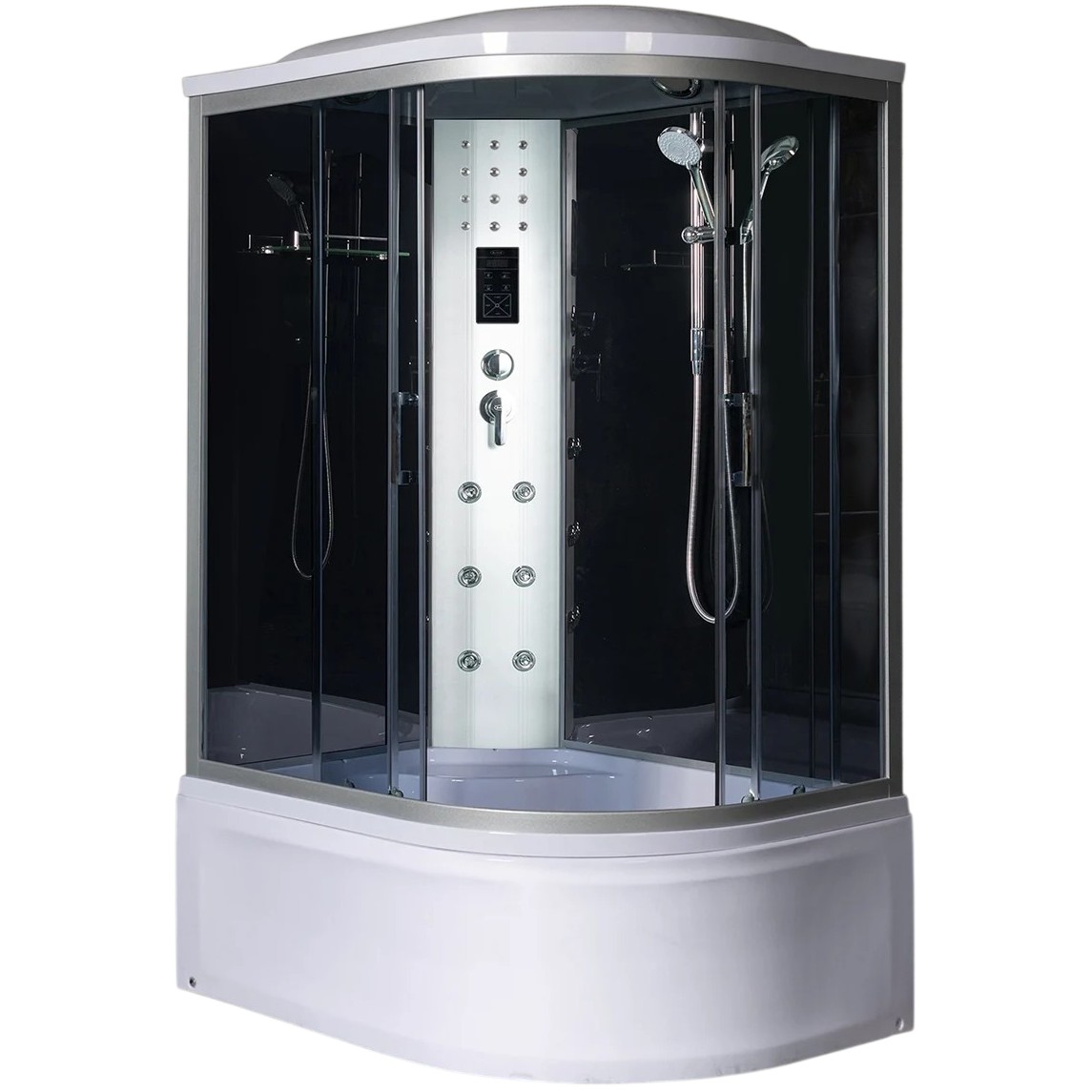 Асимметричная душевая кабина с 2 раздвижными дверями. Тонированные передние стекла. Черные задние стеклянные стенки. 6 форсунок гидромассажа. Высокий акриловый поддон со съемным экраном и антискользящим покрытием дня. Алюминиевый профиль хром матовый. Комплектация: крыша, сиденье, сифон с гидрозатвором, верхний свет, подсветка "лунный свет", полочка, радио, динамики, сенсорный пульт управления, тропический душ, ручной душ, вентиляция.