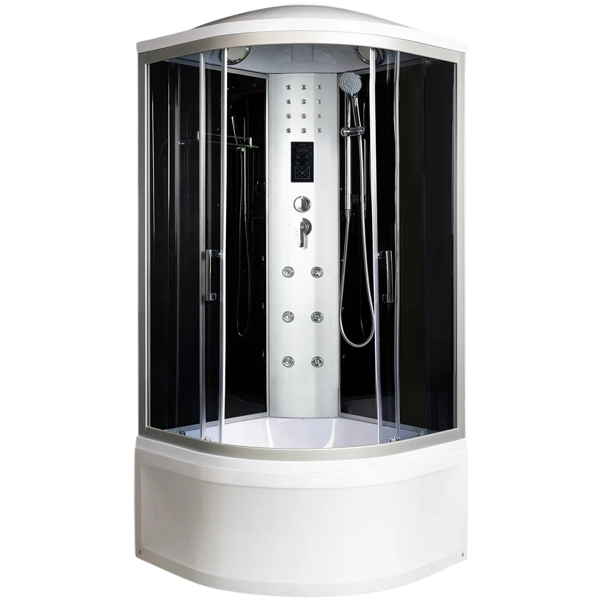 Полукруглая душевая кабина с 2 раздвижными дверями. Тонированные передние стекла. Черные задние стеклянные стенки. 6 форсунок гидромассажа. Высокий акриловый поддон со съемным экраном и антискользящим покрытием дня. Алюминиевый профиль хром матовый. Комплектация: крыша, сиденье, сифон с гидрозатвором, верхний свет, подсветка "лунный свет", полочка, радио, динамики, сенсорный пульт управления, тропический душ, ручной душ, вентиляция.