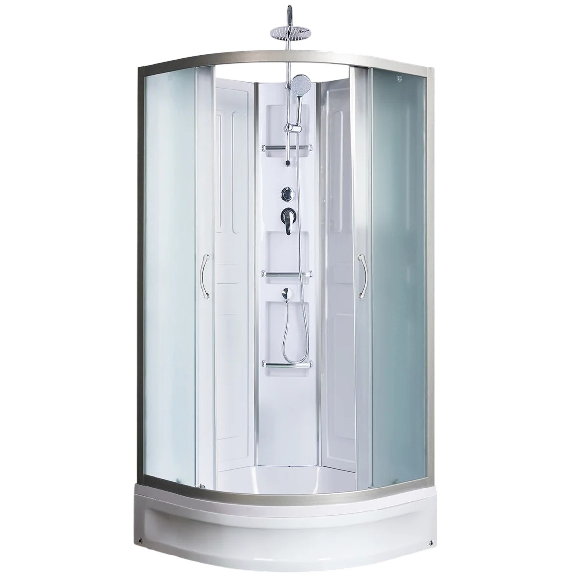 Полукруглая душевая кабина c 2 раздвижными дверями. Матовые передние стекла. Белые задние стеклянные стенки. Средний акриловый поддон со съемным экраном и антискользящим покрытием дня. Алюминиевый профиль хром матовый. Комплектация: сифон с гидрозатвором, полочка, тропический душ, ручной душ.
