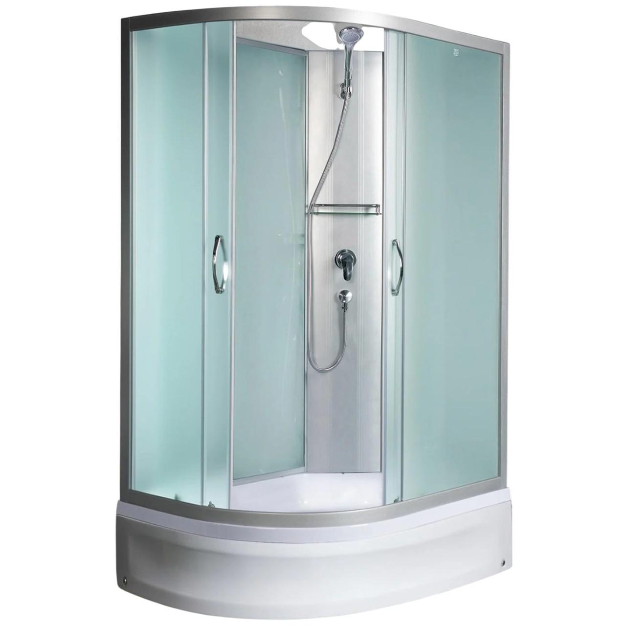 Полукруглая душевая кабина пристенного монтажа. Закаленное безопасное стекло толщиной 4 мм. Матовые передние стекла. Белые задние стеклянные стенки. Средний акриловый поддон со съемным экраном и антискользящим покрытием дня. Алюминиевый профиль хром матовый. Комплектация: ручной душ, держатель для лейки, смеситель из латуни с керамическим картриджем, полочка, сифон с гидрозатвором.