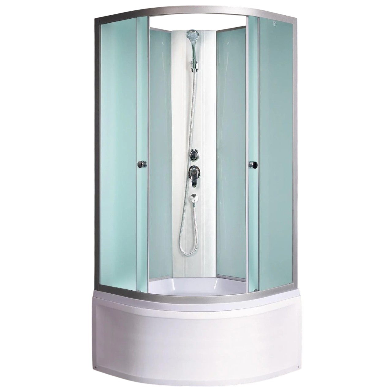 Полукруглая душевая кабина пристенного монтажа. Закаленное безопасное стекло толщиной 4 мм. Матовые передние стекла. Белые задние стеклянные стенки. Высокий акриловый поддон со съемным экраном и антискользящим покрытием дня. Алюминиевый профиль хром матовый. Комплектация: ручной душ, смеситель из латуни с керамическим картриджем, держатель для лейки, сифон с гидрозатвором.