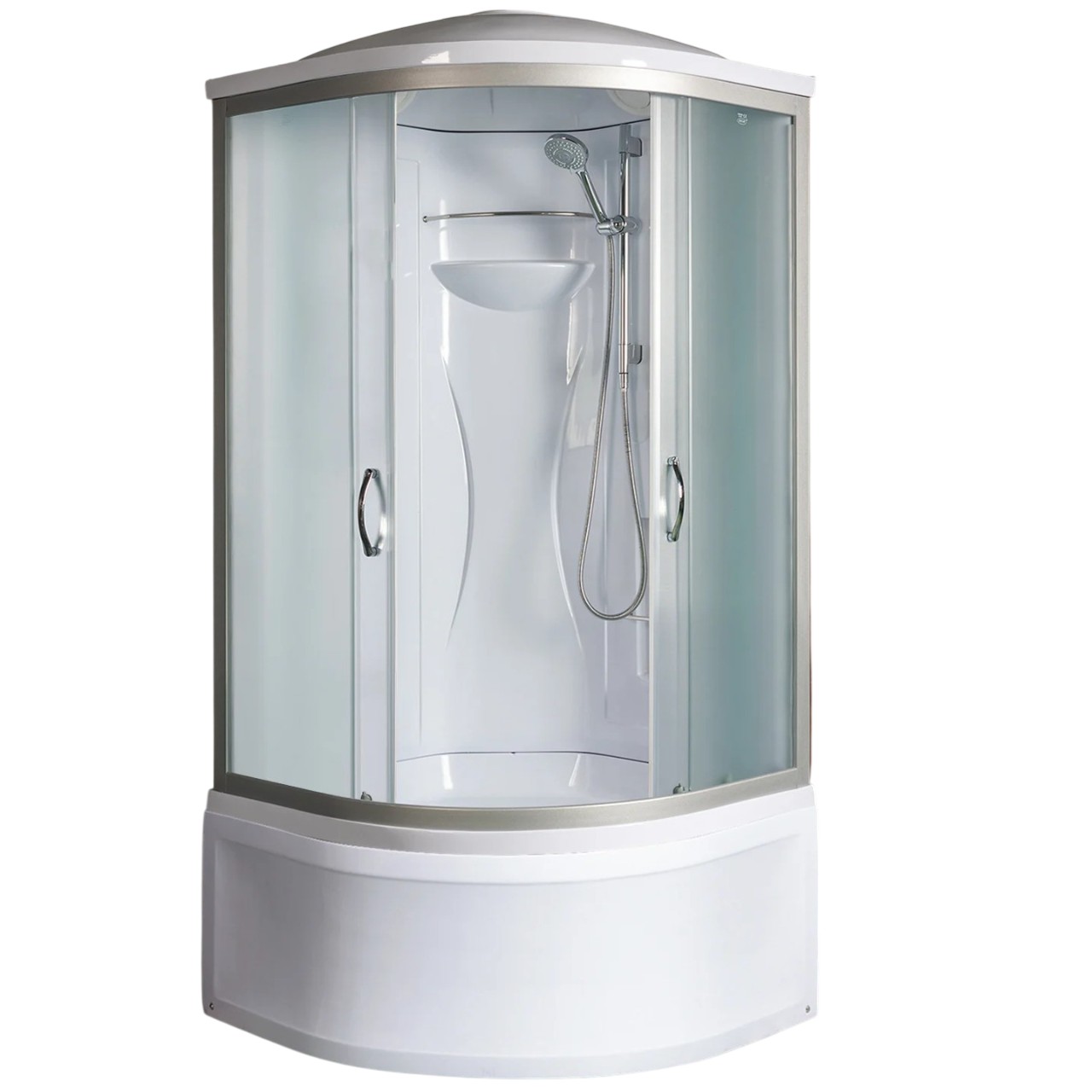 Полукруглая душевая кабина пристенного монтажа. Закаленное безопасное стекло толщиной 4 мм. Матовые передние стекла. Белые задние стеклянные стенки. Высокий акриловый поддон со съемным экраном и антискользящим покрытием дня. Алюминиевый профиль хром матовый. Комплектация: крыша, тропический душ, ручной душ, держатель для лейки, смеситель из латуни с керамическим картриджем, полочка, сифон с гидрозатвором.