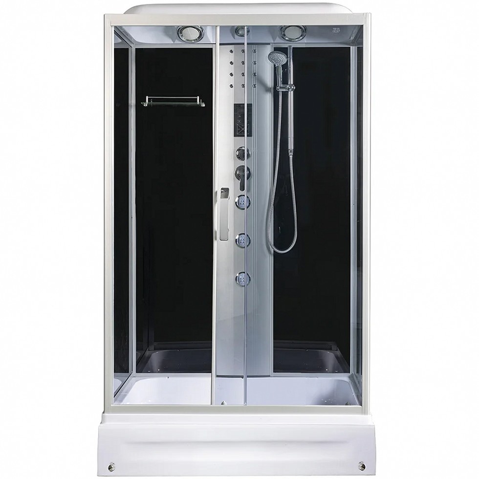 Прямоугольная душевая кабина c 1 раздвижной дверью. Тонированные передние стекла. Черные задние стеклянные стенки. 3 форсунки гидромассажа. Средний акриловый поддон со съемным экраном и антискользящим покрытием дня. Алюминиевый профиль хром матовый. Комплектация: крыша, сиденье, сифон с гидрозатвором, верхний свет, подсветка "лунный свет", полочка, зеркало, радио, динамики, сенсорный пульт управления, тропический душ, ручной душ, вентиляция.