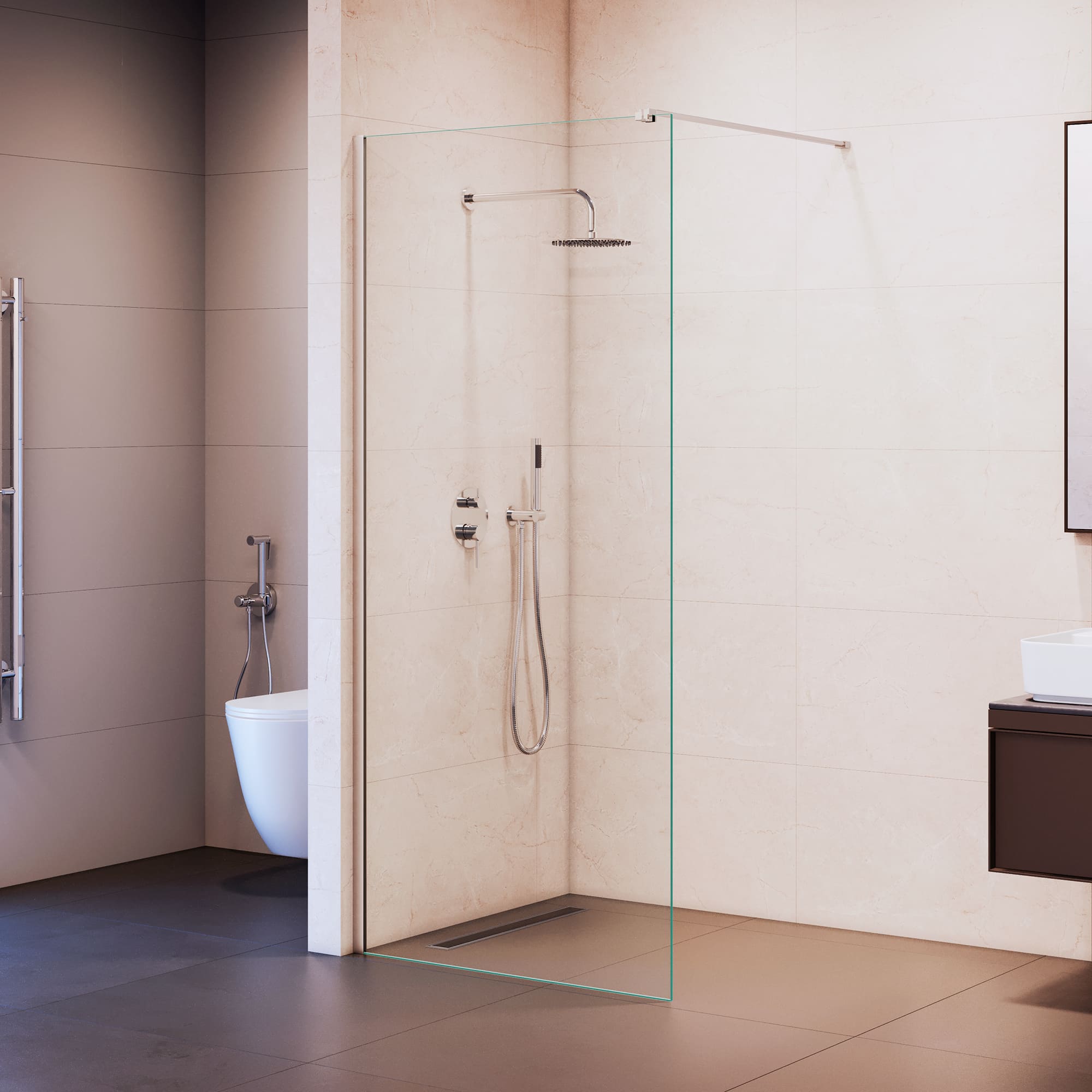 Свободный доступ: конструкция с открытым входом образует квадратную или прямоугольную беспороговую душевую зону. При желании на квадратного типа штангу вешается тканевая занавеска для создания более уединенного пространства.