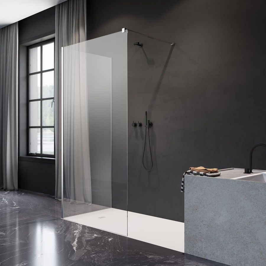 Безопасное закалённое стекло толщиной 8 мм, согласно стандарту PN:EN 12150:1. Стекло крепится к стене с помощью пристенных профилей (с регулировкой). Эту душевую перегородку возможно установить так на поддоне, как и непосредственно на пол. Защитное покрытие помогает содержать чистоту на поверхности стекол. Благодаря водоотталкивающим свойствам капли воды не удерживаются на поверхности стекла и быстро стекают, не оставляя следа. Это изделие подлежит модификациям. Изделие доступно в нескольких вариантах стекла. Возможность сделать гравировку на стекле. По умолчанию вся продукция укомплектована горизонтальными стабилизаторами. Если нет возможности прикрепить этот стабилизатор к стене, разрешите предложить Вам телескопический стабилизатор к потолку. Максимальная высота потолка 3 метра. Держатель для полотенец под заказ - крепится к 2 точкам на стекле, либо к стеклу и стене.