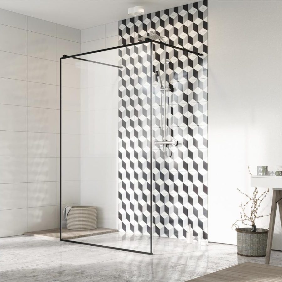 Безопасное закалённое стекло толщиной 10 мм, согласно стандарту PN:EN 12150:1. Система крепления к стене с помощью стабилизаторов - обеспечивает прочную конструкцию перегородки. Элегантная черная матовая фурнитура. Эту душевую перегородку возможно установить так на поддоне, как и непосредственно на пол. Продукция подходит для инвалидов. Защитное покрытие помогает содержать чистоту на поверхности стекол. Благодаря водоотталкивающим свойствам капли воды не удерживаются на поверхности стекла и быстро стекают, не оставляя следа. Это изделие подлежит модификациям. Возможность сделать гравировку на стекле.