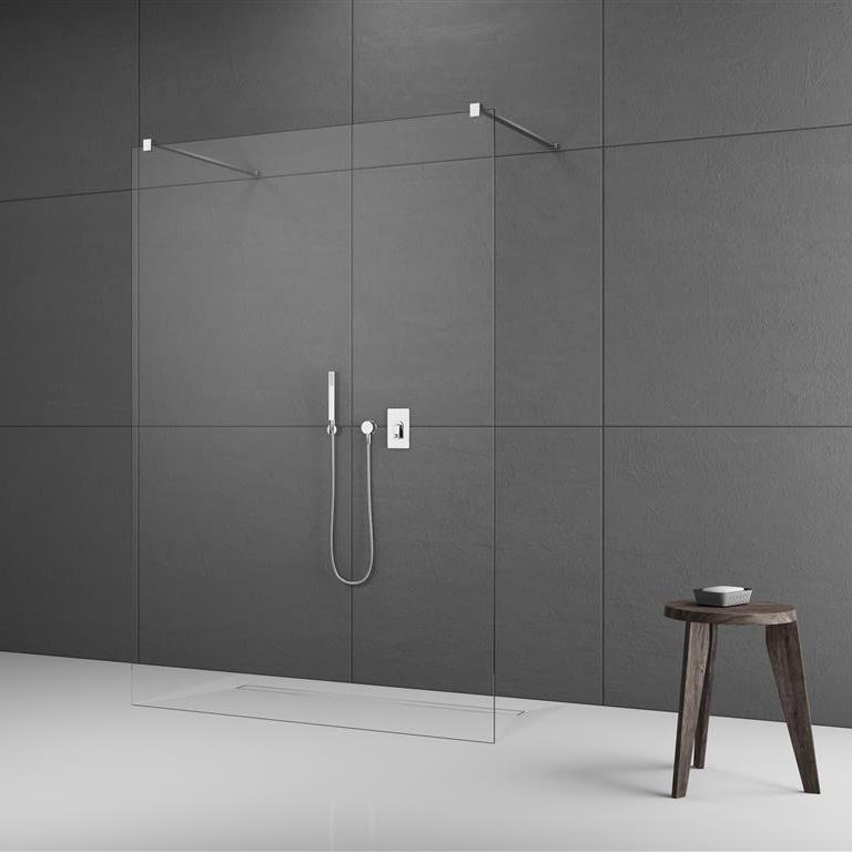 Безопасное закалённое стекло толщиной 10 мм, согласно стандарту PN:EN 12150:1. Система крепления к стене с помощью стабилизаторов - обеспечивает прочную конструкцию кабины. Элегантная хромированная фурнитура. Эту душевую перегородку возможно установить так на поддоне, как и непосредственно на пол. Продукция подходит для инвалидов. Защитное покрытие помогает содержать чистоту на поверхности стекол. Благодаря водоотталкивающим свойствам капли воды не удерживаются на поверхности стекла и быстро стекают, не оставляя следа. Это изделие подлежит модификациям. Возможность сделать гравировку на стекле. Под заказ - крепится к 2-ум точкам на стекле, либо к стеклу и стене.