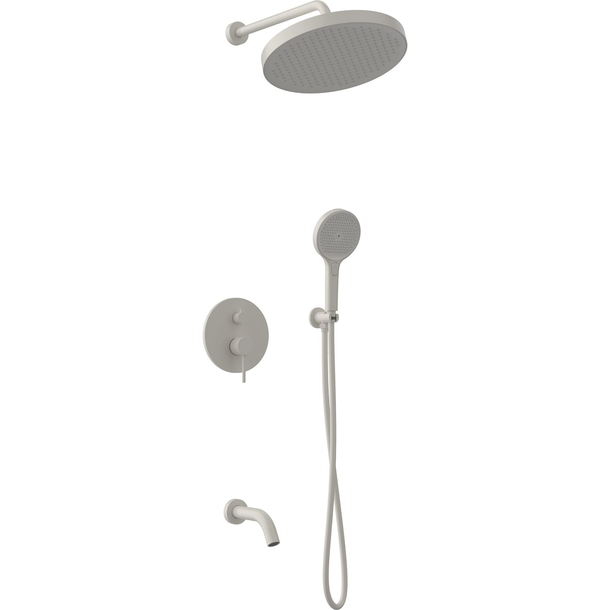 В комплекте: встраиваемая часть, смеситель с трехпозиционным переключением, излив, штуцер/держатель ручного душа, ручной душ, гибкий полимерный шланг, верхний душ, кронштейн держатель для верхнего душа, отражатели, установочный комплект.