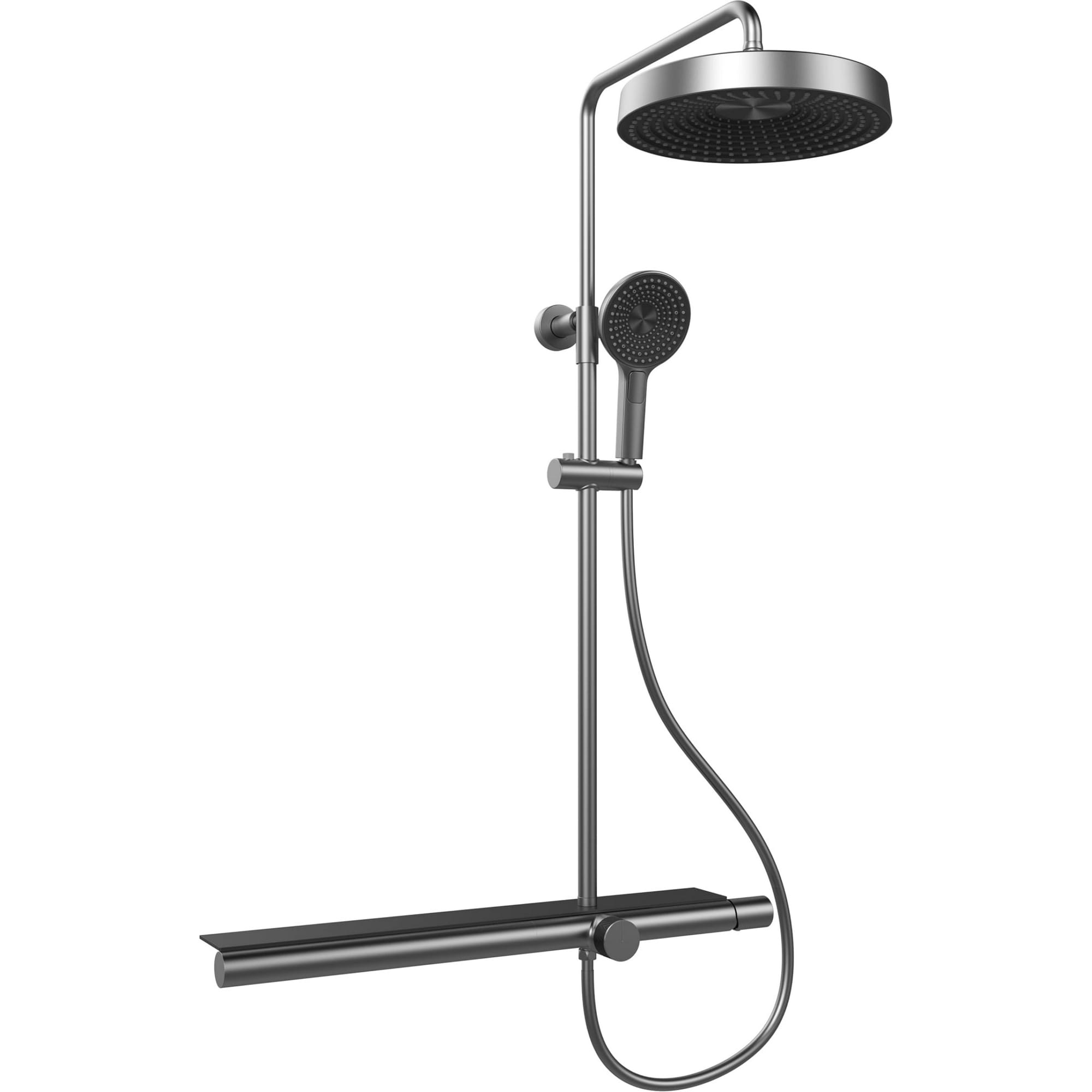 Смеситель настенного монтажа, телескопическая штанга с держателем для ручного душа, ручной душ, гибкий полимерный шланг, верхний душ, аэратор, эксцентрики, чаши декоративные.