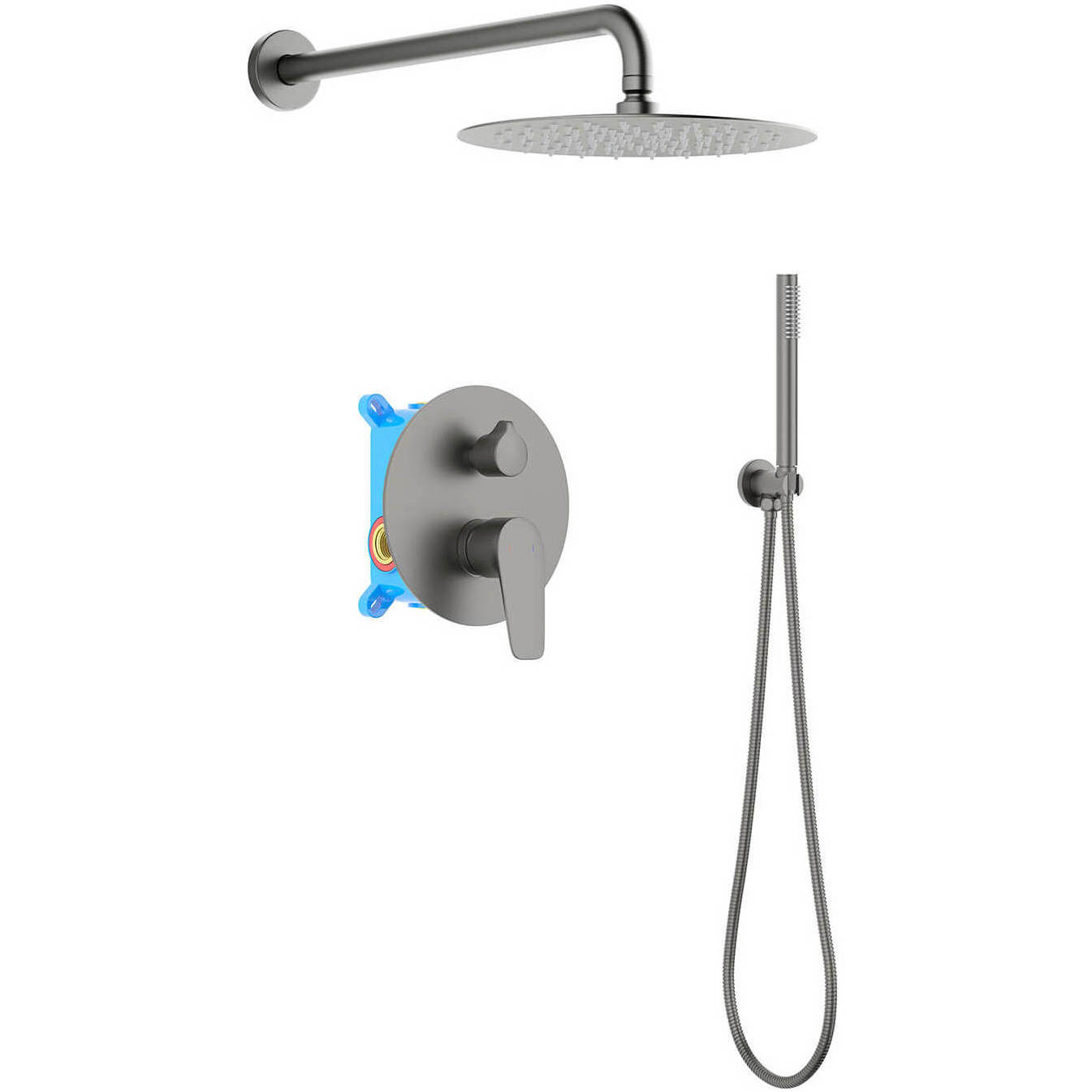 Смеситель из латуни с установочной коробкой на 2 потребителя (внешняя и скрытая часть). Душевой гарнитур: лейка, шланг, шланговое подсоединение с держателем. Верхний душ. Декоративные накладки на стену из нержавеющей стали 3 мм.