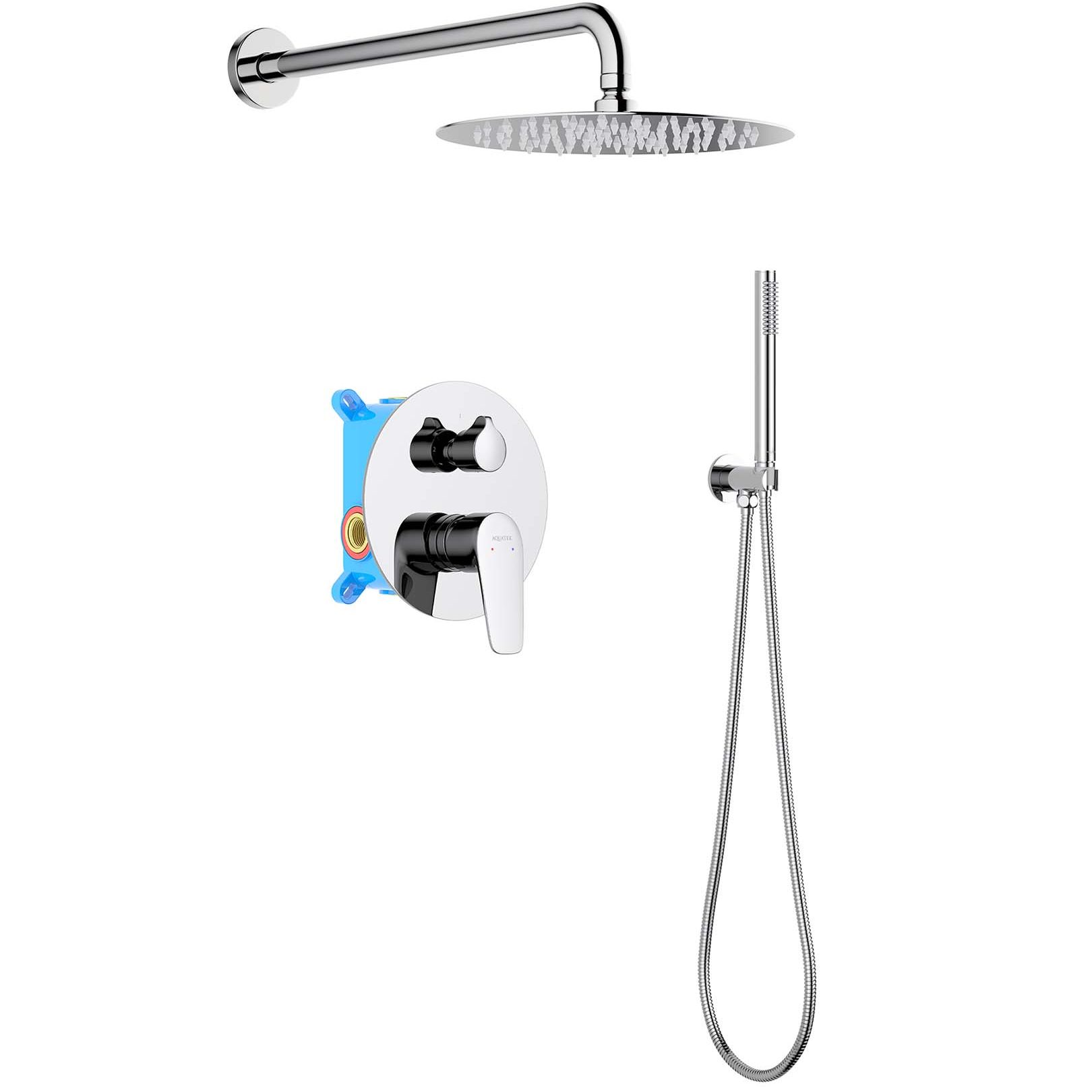 Смеситель из латуни с установочной коробкой на 2 потребителя (внешняя и скрытая часть). Душевой гарнитур: лейка, шланг, шланговое подсоединение с держателем. Верхний душ. Декоративные накладки на стену из нержавеющей стали 3 мм.