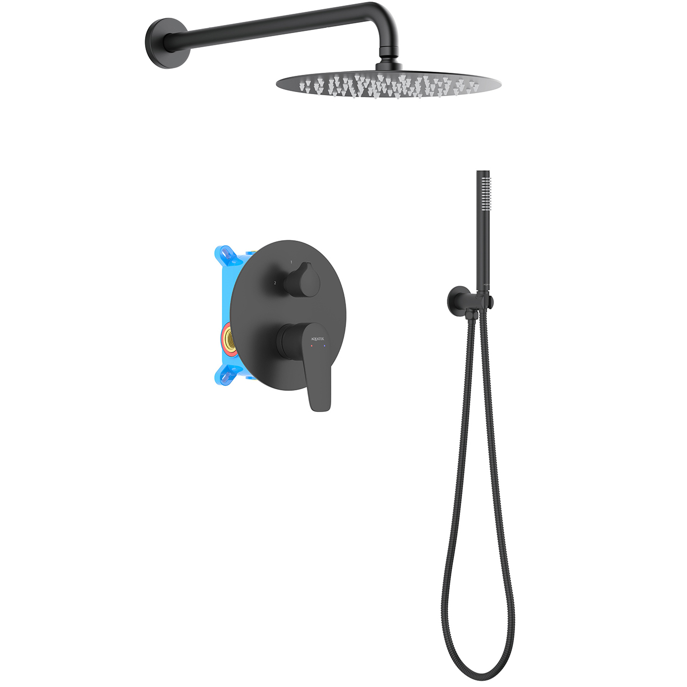 Смеситель из латуни с установочной коробкой на 2 потребителя (внешняя и скрытая часть). Душевой гарнитур: лейка, шланг, шланговое подсоединение с держателем. Верхний душ. Декоративные накладки на стену из нержавеющей стали 3 мм.