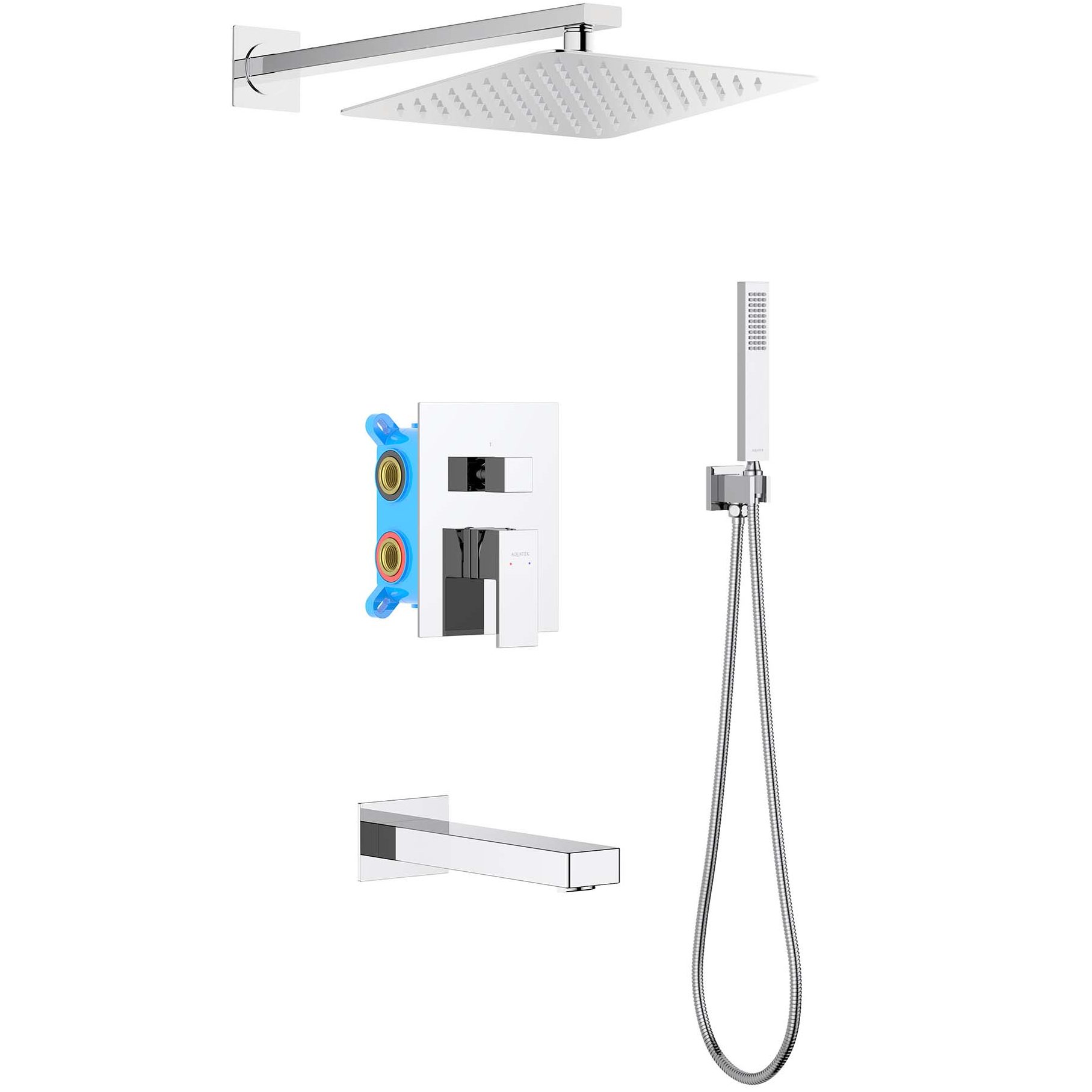 Смеситель из латуни с установочной коробкой на 3 потребителя (внешняя и скрытая часть). Душевой гарнитур: лейка, шланг, шланговое подсоединение с держателем. Верхний душ. Излив. Декоративные накладки на стену из нержавеющей стали 3 мм.