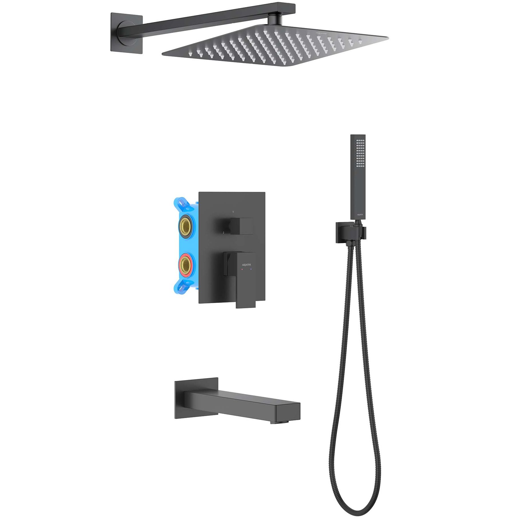 Смеситель из латуни с установочной коробкой на 3 потребителя (внешняя и скрытая часть). Душевой гарнитур: лейка, шланг, шланговое подсоединение с держателем. Верхний душ. Излив. Декоративные накладки на стену из нержавеющей стали 3 мм.