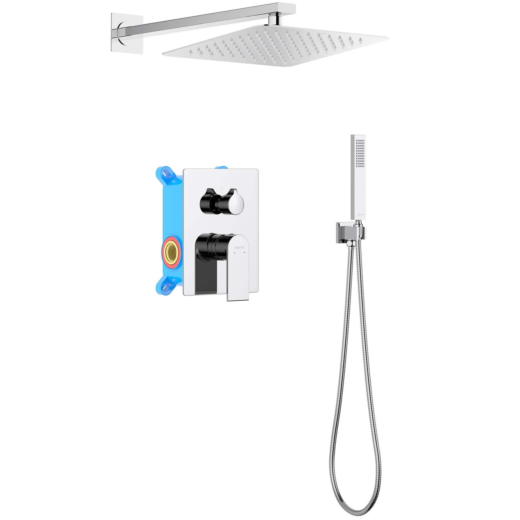 Смеситель из латуни с установочной коробкой на 2 потребителя (внешняя и скрытая часть). Душевой гарнитур: лейка, шланг, шланговое подсоединение с держателем. Верхний душ. Декоративные накладки на стену из нержавеющей стали 3 мм.