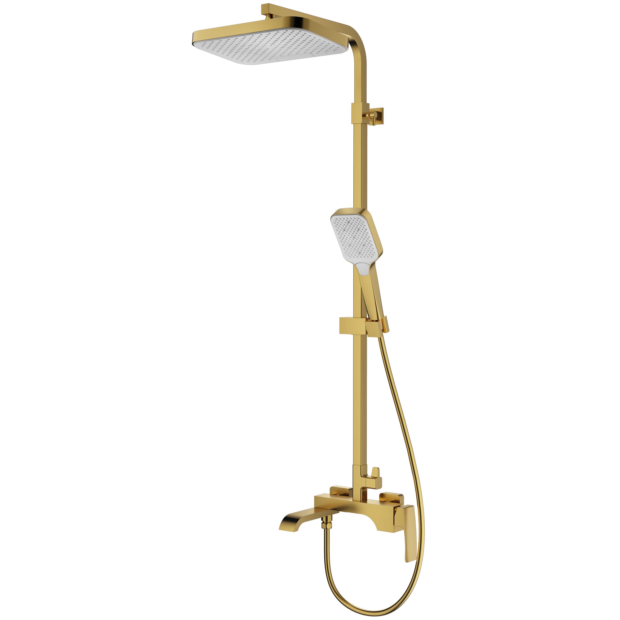 Материал – латунь. Керамический картридж 35 мм. Переключатель с керамическими пластинами (угол поворота – 90°). Излив с функцией переключения. Аэратор. Душевой шланг 1.5 м. Душевая лейка 3 режима. Верхний душ 320x210 мм. Эксцентрики с отражателями, держатель лейки, крепеж штанги.