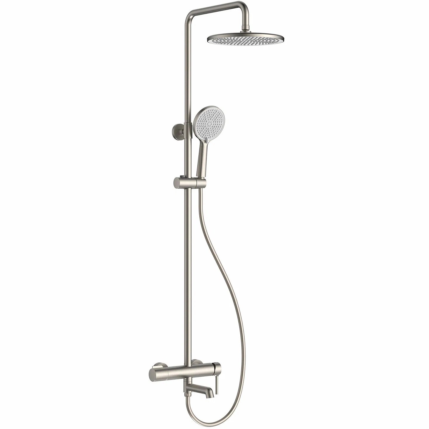 Материал – латунь. Керамический картридж 35 мм. Переключатель с керамическими пластинами (угол поворота – 180°). Излив с функцией переключения. Аэратор. Душевой шланг 1.5 м. Душевая лейка 3 режима. Верхний душ Ø250 мм. Эксцентрики с отражателями, держатель лейки, крепеж штанги.