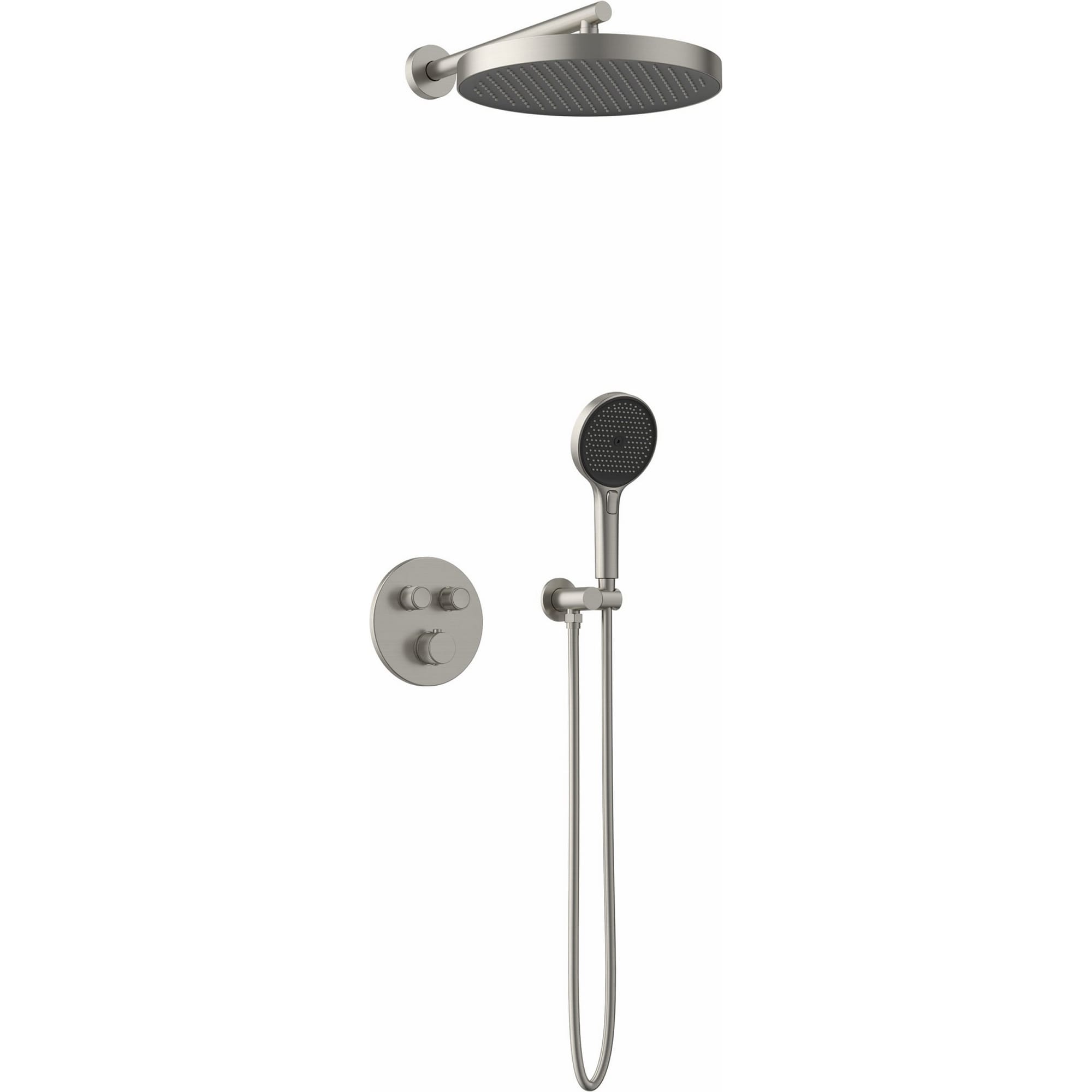 Дополнительные свойства: система ToccoFreddo - исключает возможность ожога о внешнюю поверхность смесителя, система Gioco верхнего душа, пластиковый верхний душ 32 см, гибкий полимерный шланг с защитой от заломов, двухрежимный пластиковый ручной душ с переключателями с внутренней и внешней стороны, встраиваемая часть в установочном боксе оснащена уровнем, кнопочное переключение на режим верхней и ручной лейки. Комплектация: встраиваемая часть, термостатический смеситель, штуцер/держатель ручного душа, ручной душ, гибкий полимерный шланг, верхний душ, кронштейн излив для верхнего душа, отражатели, установочный комплект.