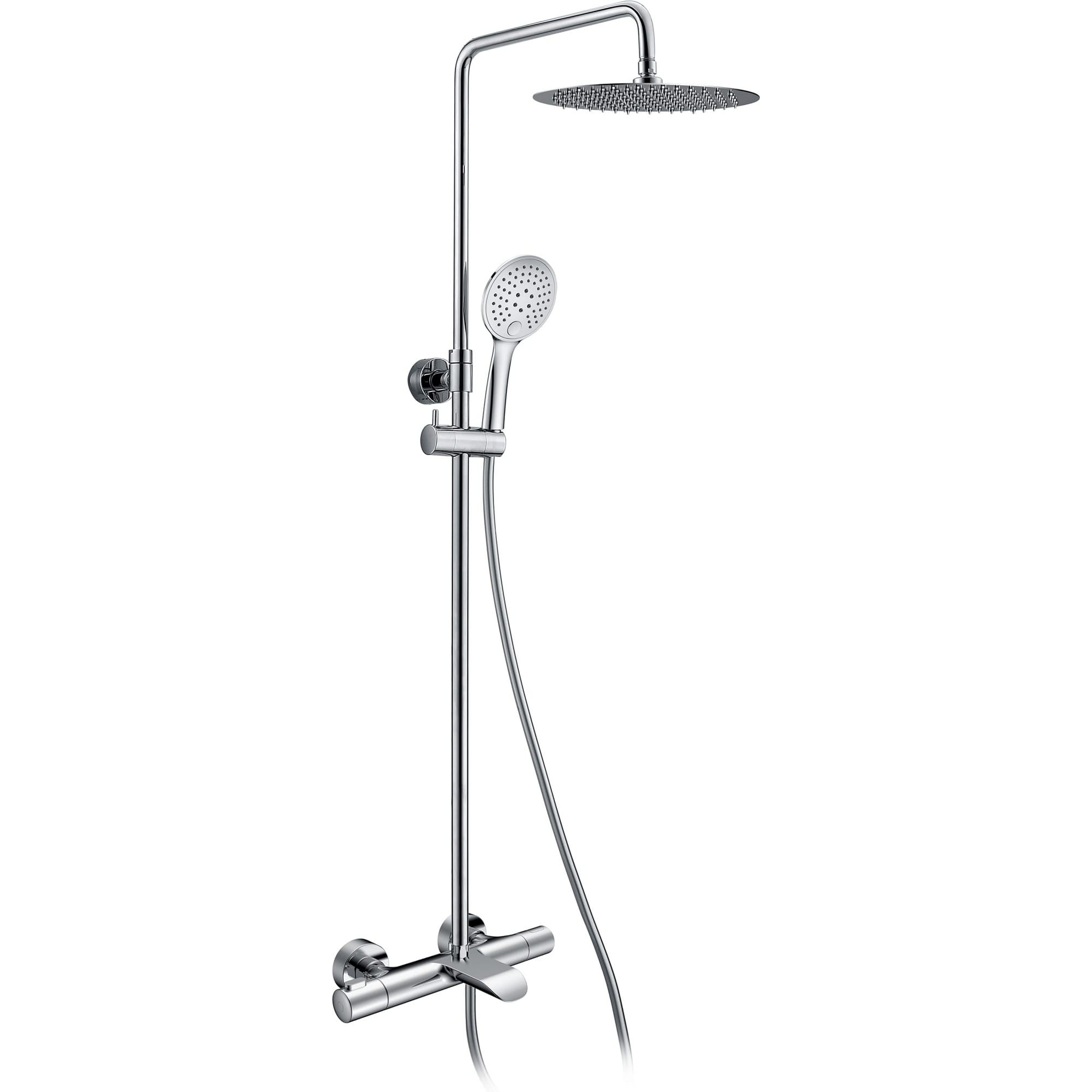Дополнительные свойства: система ToccoFreddo - исключает возможность ожога о внешнюю поверхность смесителя, система Telescopico - дает возможность регулирования высоты душевой системы, система Gioco верхнего душа, латунный верхний душ, ручной душ, гибкий полимерный шланг с защитой от заломов и гладкой поверхностью, аэратор - смешивающий воду с воздухом и рассеивает ее, для более объемной и мягкой воды. Комплектация: термостатический смеситель, телескопическая штанга с держателем для ручного душа, ручной душ, гибкий полимерный шланг, латунный верхний душ, аэратор, эксцентрики, чаши декоративные.