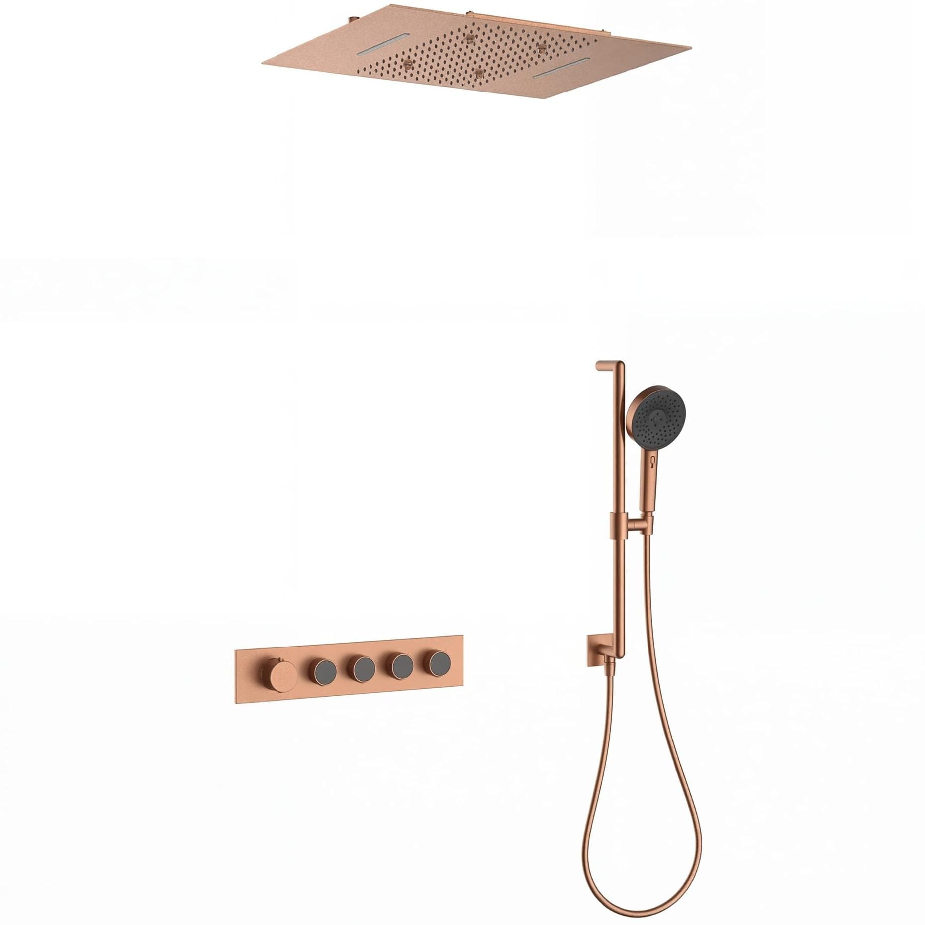 Размер верхнего душа 480x580 мм. PVD-покрытие. Комплектация: встраиваемая часть, термостатический смеситель , штуцер/держатель ручного душа, латунный двухрежимный ручной душ, гибкий полимерный шланг, латунный мультифункциональный верхний душ, установочный комплект.