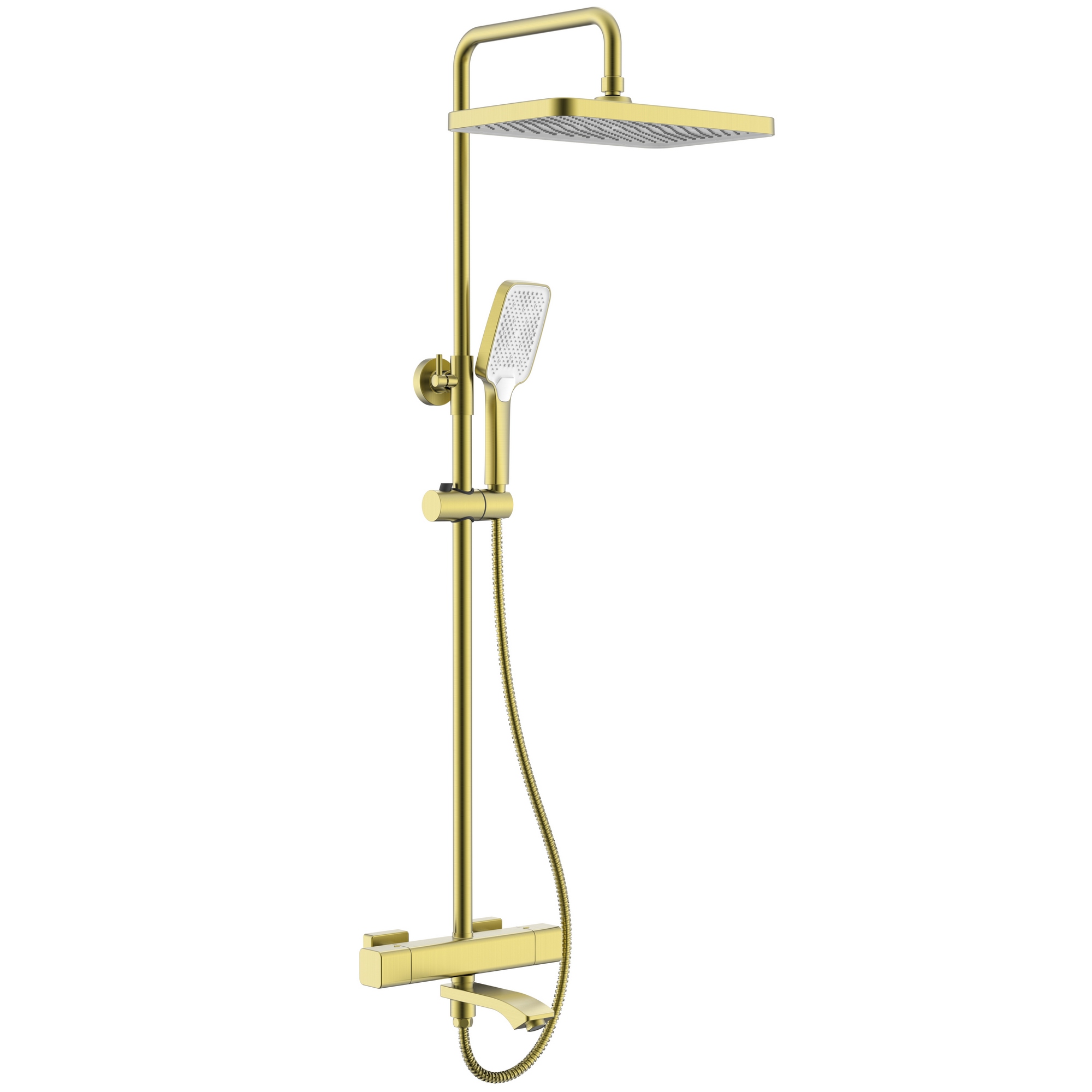 Материал – латунь. Керамический картридж 35 мм. Переключатель с керамическими пластинами (угол поворота – 180°). Излив с функцией переключения. Аэратор. Душевой шланг 1.5 м. Душевая лейка 3 режима. Верхний душ 340x220 мм. Эксцентрики с отражателями, держатель лейки, крепеж штанги.
