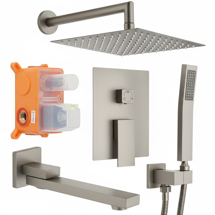 Верхний тропический душ с регулировкой угла наклона. Ручная однорежимная лейка. Поворотный излив 180°. Смеситель однорычажный. Монтажный короб с уровнем. Керамический картридж Sedal. Шланг в металлической оплетке 1500 мм.