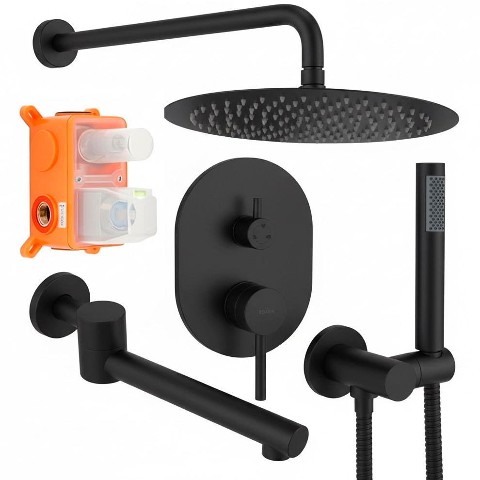 Верхний тропический душ с регулировкой угла наклона. Ручная однорежимная лейка. Поворотный излив 180°. Смеситель однорычажный. Монтажный короб с уровнем. Керамический картридж Sedal. Шланг в металлической оплетке 1500 мм.