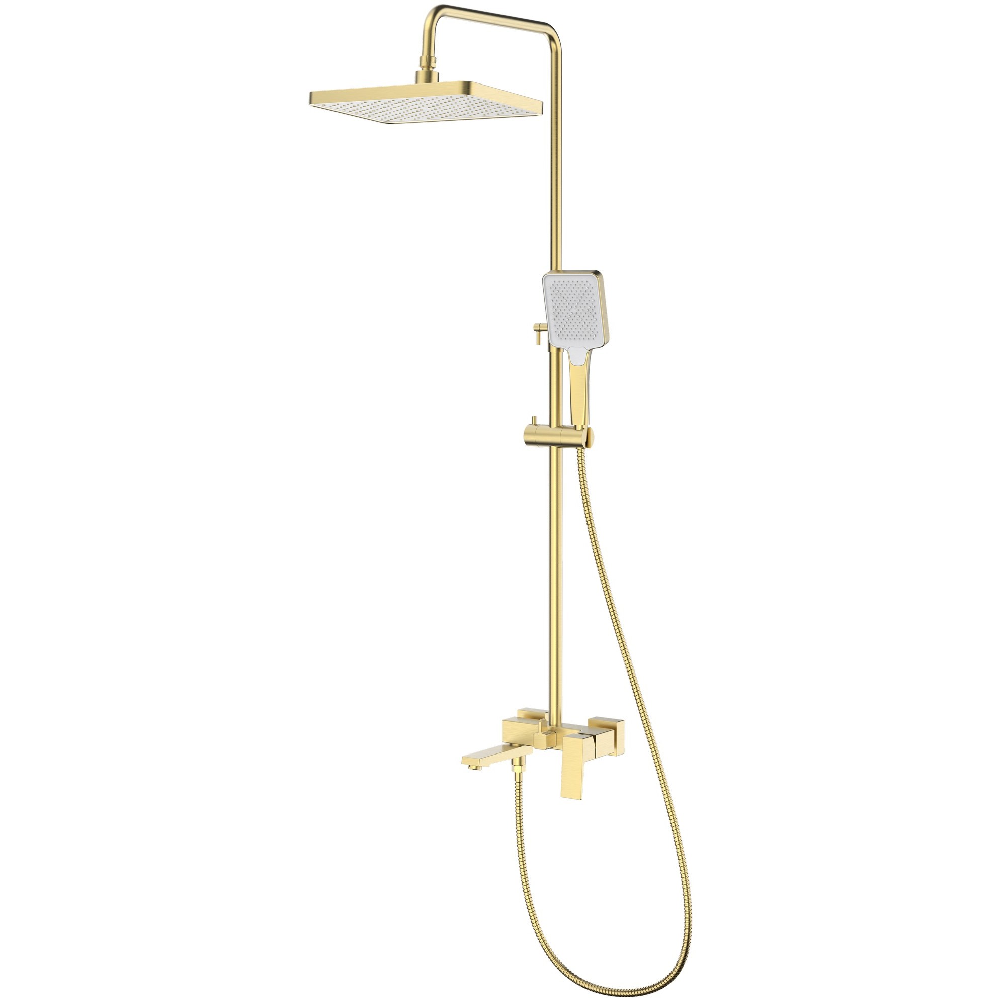 Материал – латунь. Цвет – золотой сатин. Керамический картридж. Переключатель с керамическими пластинами. Душевой шланг 1.5 м. Душевая лейка – 3 режима. Верхний душ – 320x210 мм. Излив с функцией переключения. Эксцентрики с отражателями. Держатель лейки. Крепеж штанги.