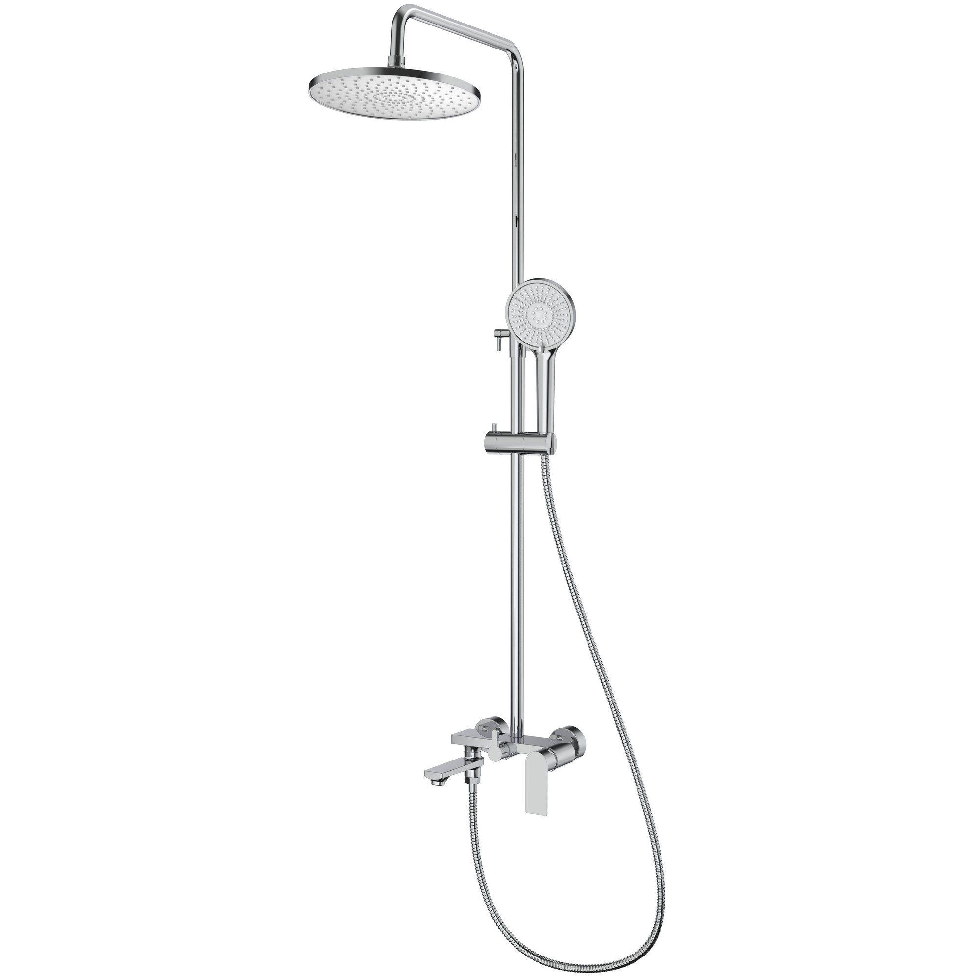 Материал – латунь. Цвет – хром. Керамический картридж. Переключатель с керамическими пластинами. Душевой шланг 1.5 м. Душевая лейка – 3 режима. Верхний душ – Ø250 мм. Излив с функцией переключения. Эксцентрики с отражателями. Держатель лейки. Крепеж штанги.