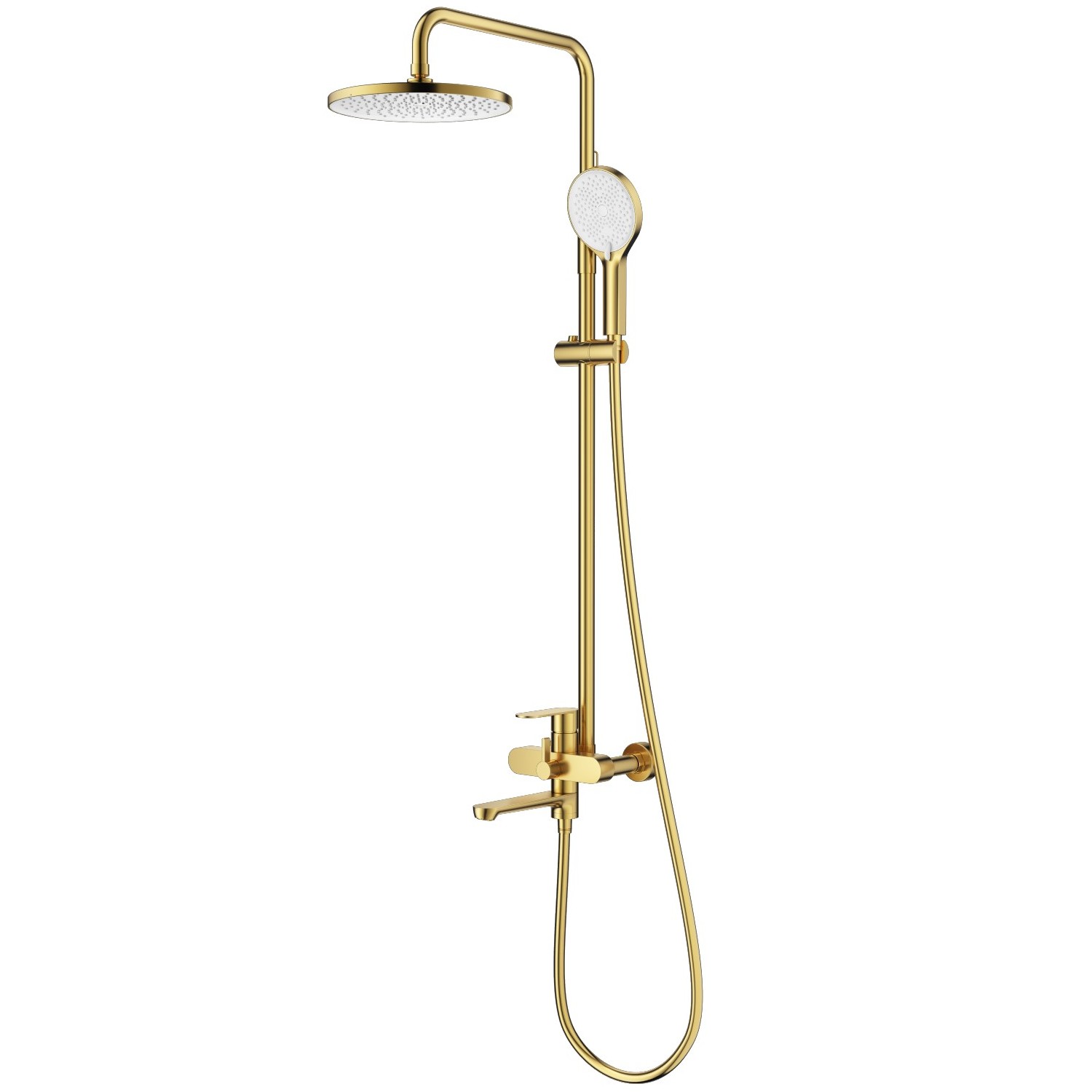 Материал – латунь. Цвет – золотой сатин. Керамический картридж. Переключатель с керамическими пластинами. Душевой шланг 1.5 м. Душевая лейка – 3 режима. Верхний душ – Ø250 мм. Излив с функцией переключения. Эксцентрики с отражателями. Держатель лейки. Крепеж штанги.