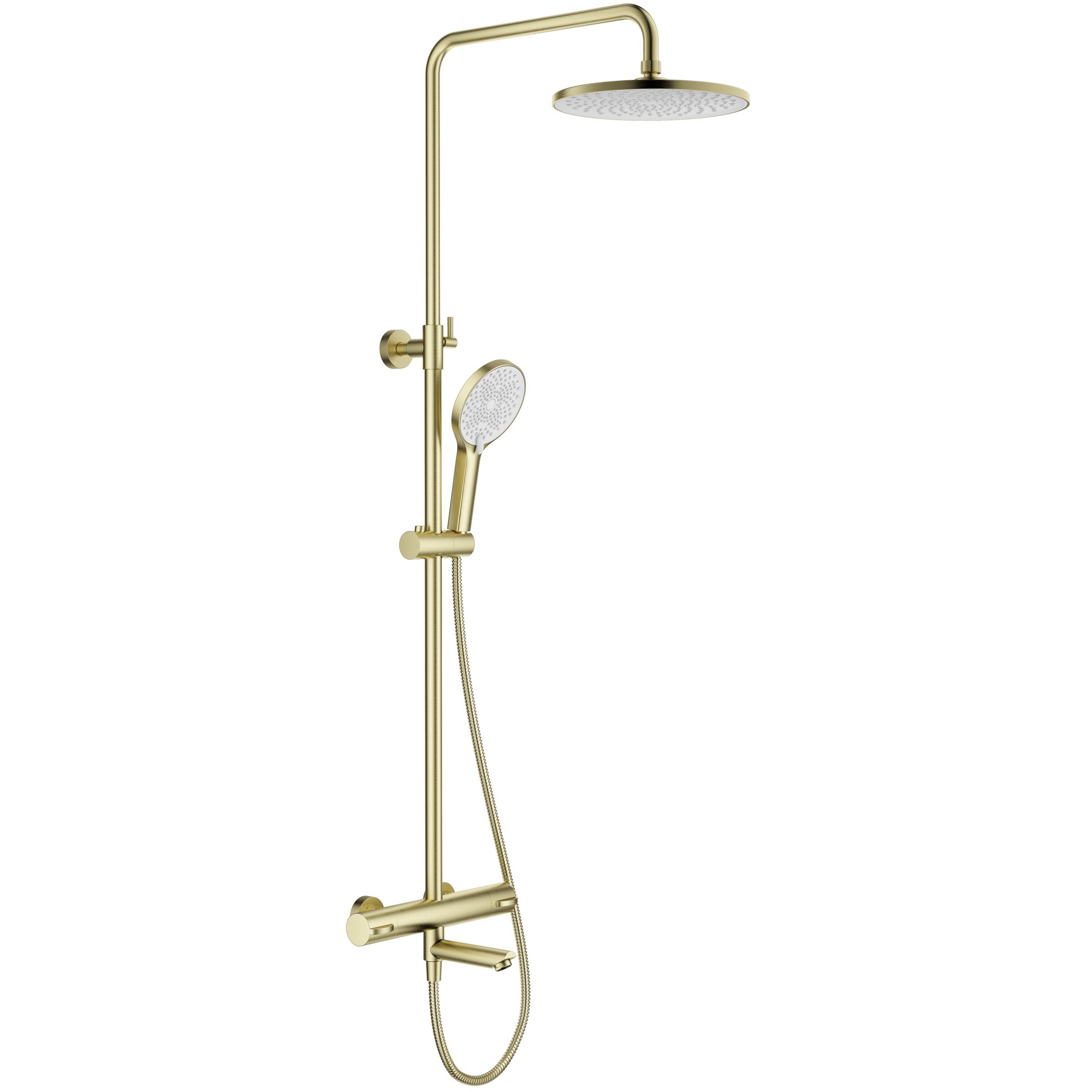 Материал – латунь. Цвет – золото сатин. Термостатический картридж. Переключатель с керамическими пластинами. Излив с функцией переключения. Душевой шланг 1.5 м. Душевая лейка – 3 режима. Верхний душ – Ø250 мм. Эксцентрики с отражателями. Держатель лейки. Крепеж штанги.