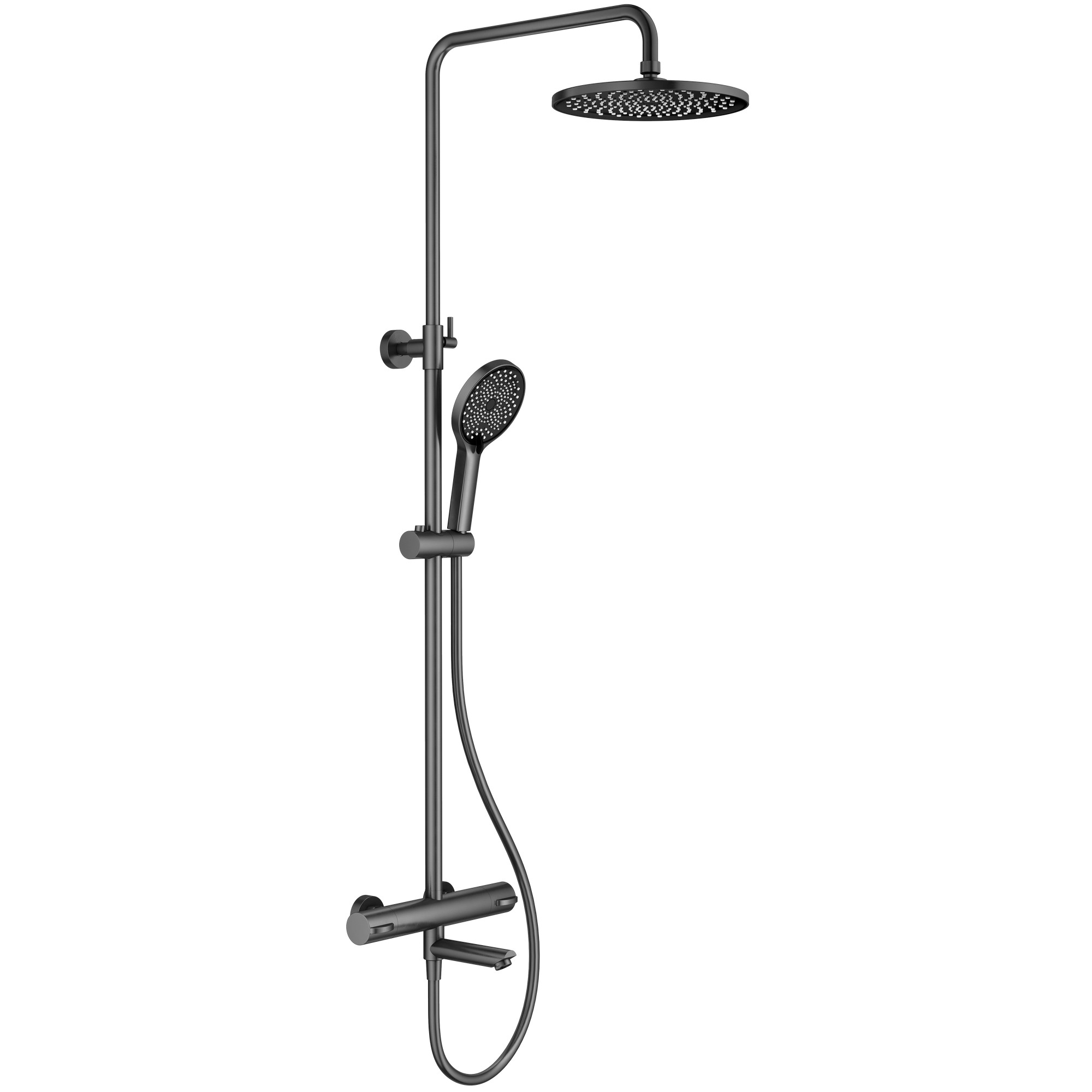 Материал – латунь. Цвет – графит. Термостатический картридж. Переключатель с керамическими пластинами. Излив с функцией переключения. Душевой шланг 1.5 м. Душевая лейка – 3 режима. Верхний душ – Ø250 мм. Эксцентрики с отражателями. Держатель лейки. Крепеж штанги.