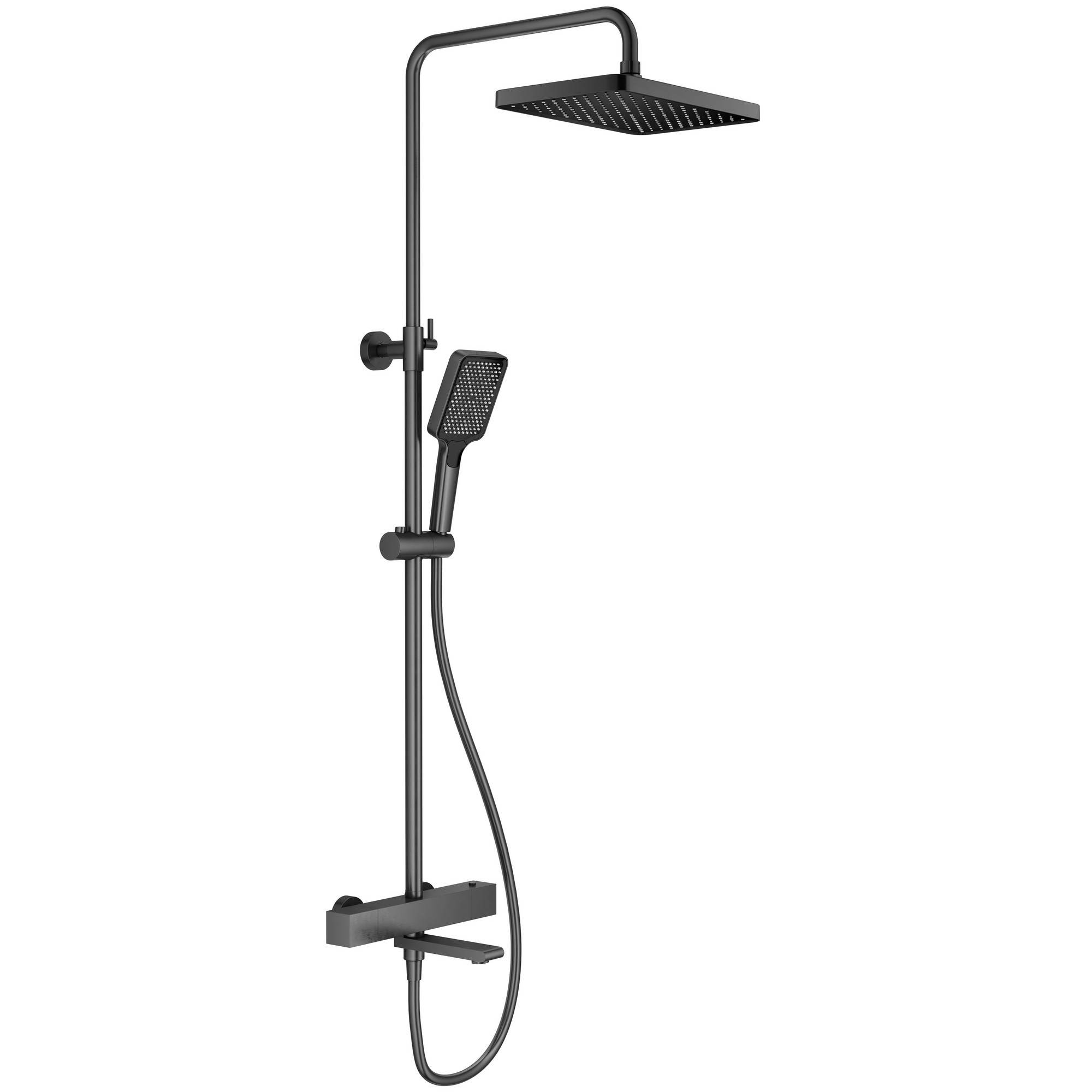Материал – латунь. Цвет – графит. Термостатический картридж. Переключатель с керамическими пластинами. Излив с функцией переключателя. Душевой шланг 1.5 м. Душевая лейка – 3 режима. Верхний душ – 320x210 мм. Эксцентрики с отражателями. Держатель лейки. Крепеж штанги.