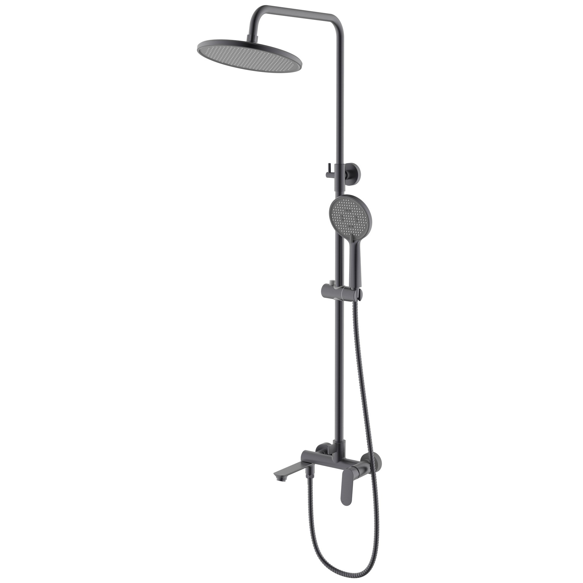 Материал – латунь. Цвет – графит. Керамический картридж. Переключатель с керамическими пластинами. Переключатель в изливе. Душевой шланг 1.5 м. Душевая лейка – 3 режима. Верхний душ – Ø250 мм. Эксцентрики с отражателями. Держатель лейки. Крепеж штанги.