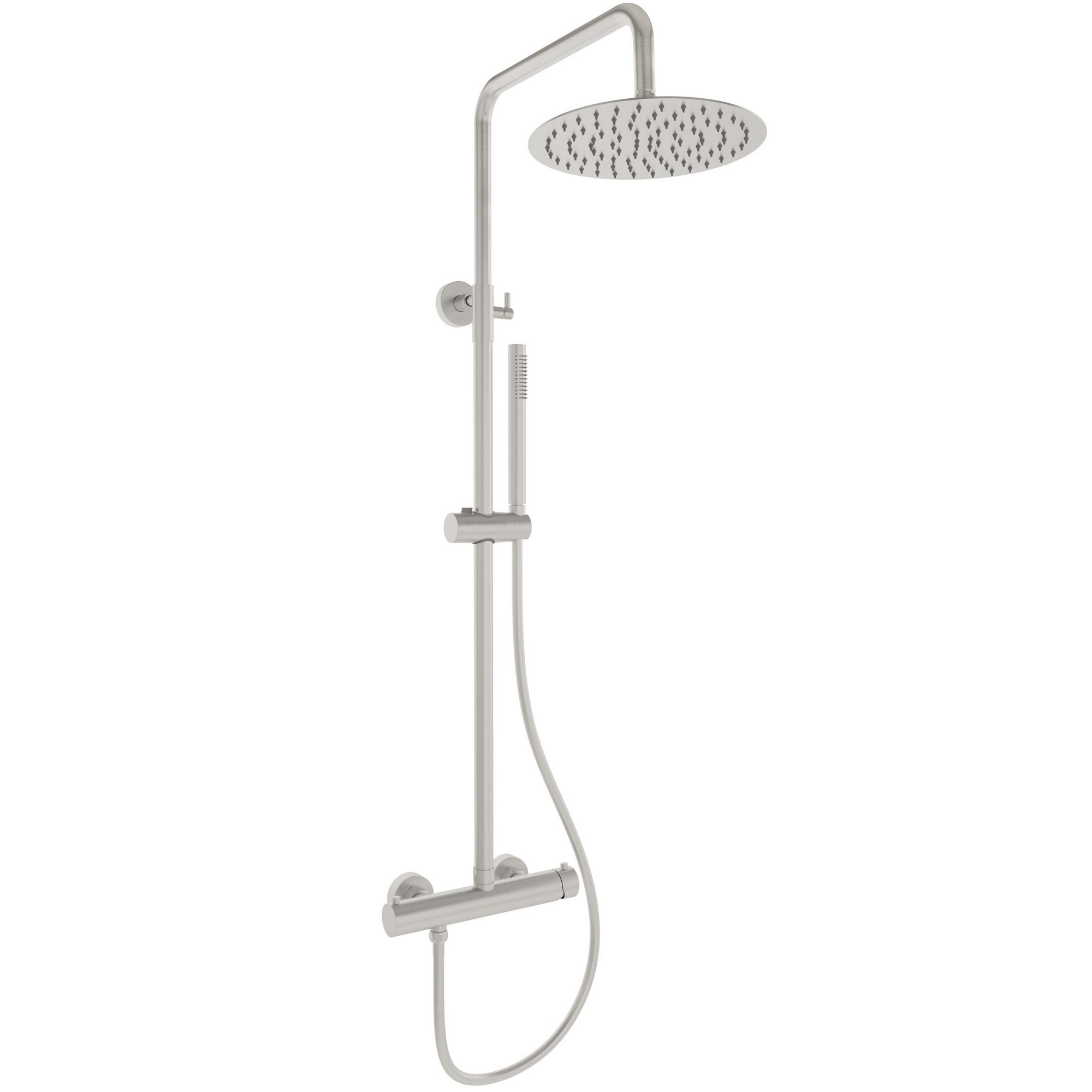 Душевая система настенного монтажа. Ширина 277 мм. Высота 854-1184 мм. Материал: нержавеющая сталь. Керамический картридж. Круглый верхний душ диаметром 250 мм. Без излива.