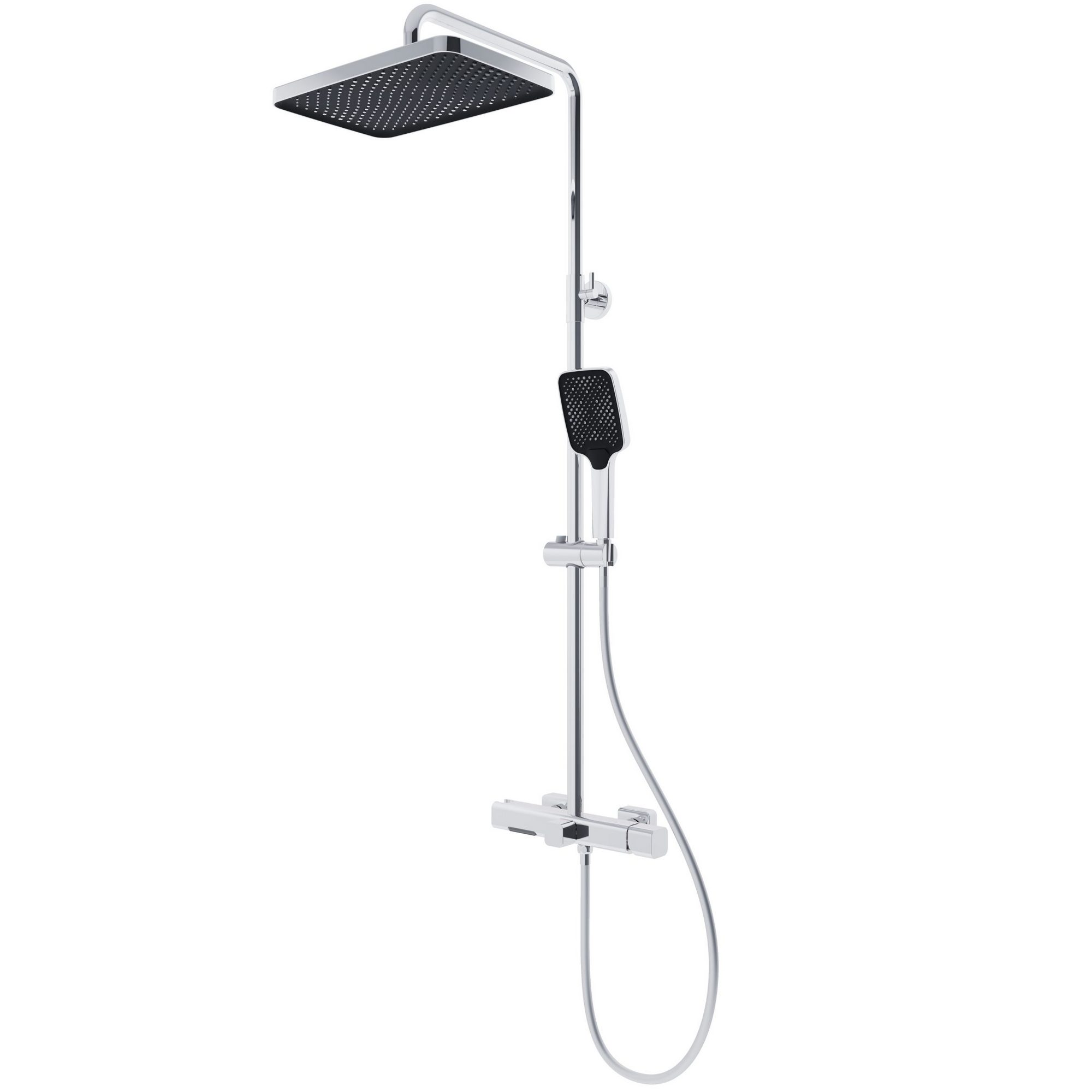 Душевая система настенного монтажа. Ширина 309 мм. Высота 908-1308 мм. Материал: латунь. Керамический картридж. Прямоугольный верхний душ диаметром 340x220 мм. Каскадный излив. Ручной душ 3 функции.