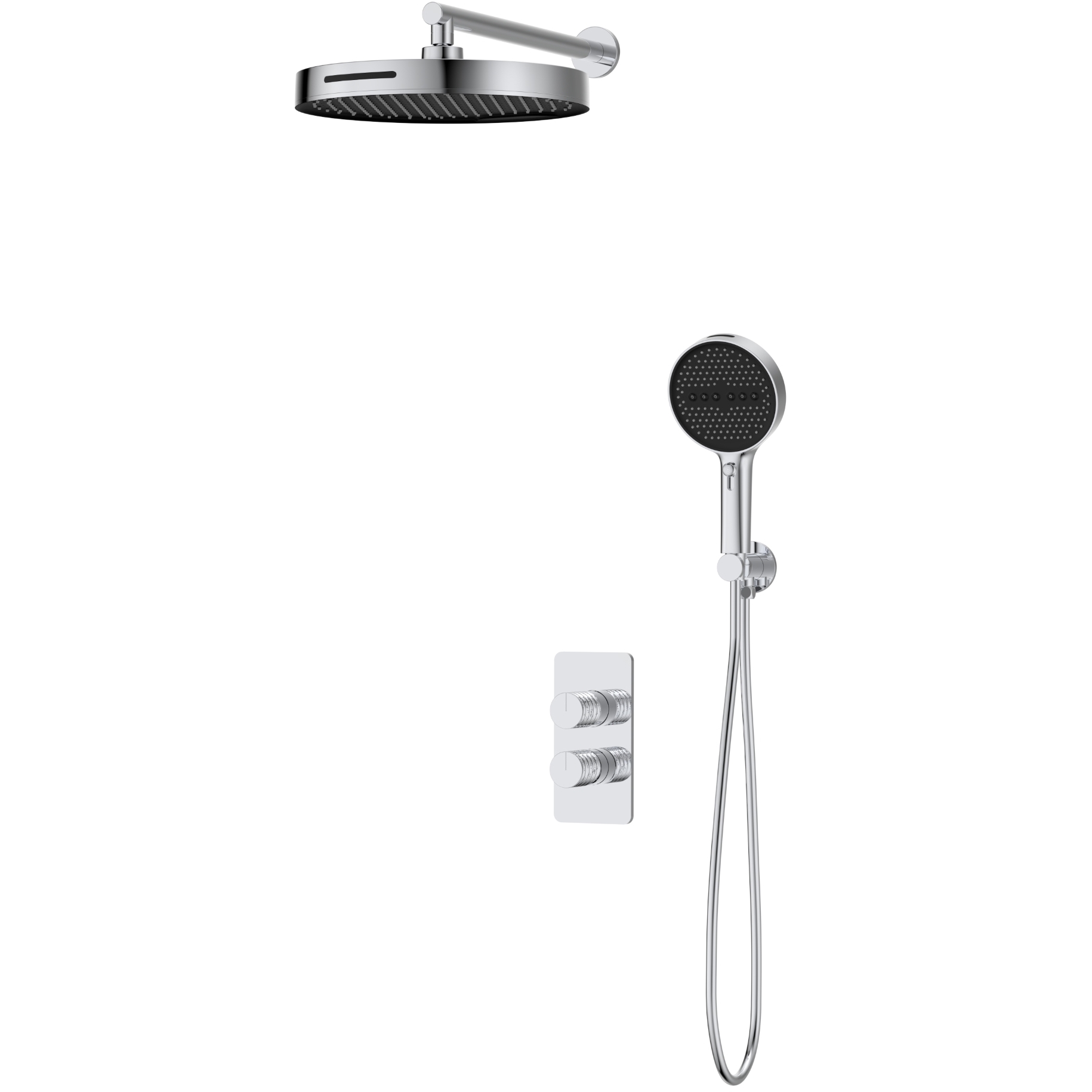 Душевая система встраиваемого монтажа. Материал: латунь. Керамический картридж. Круглый верхний душ 300 мм, 2 потока. Ручной душ 2 функции.
