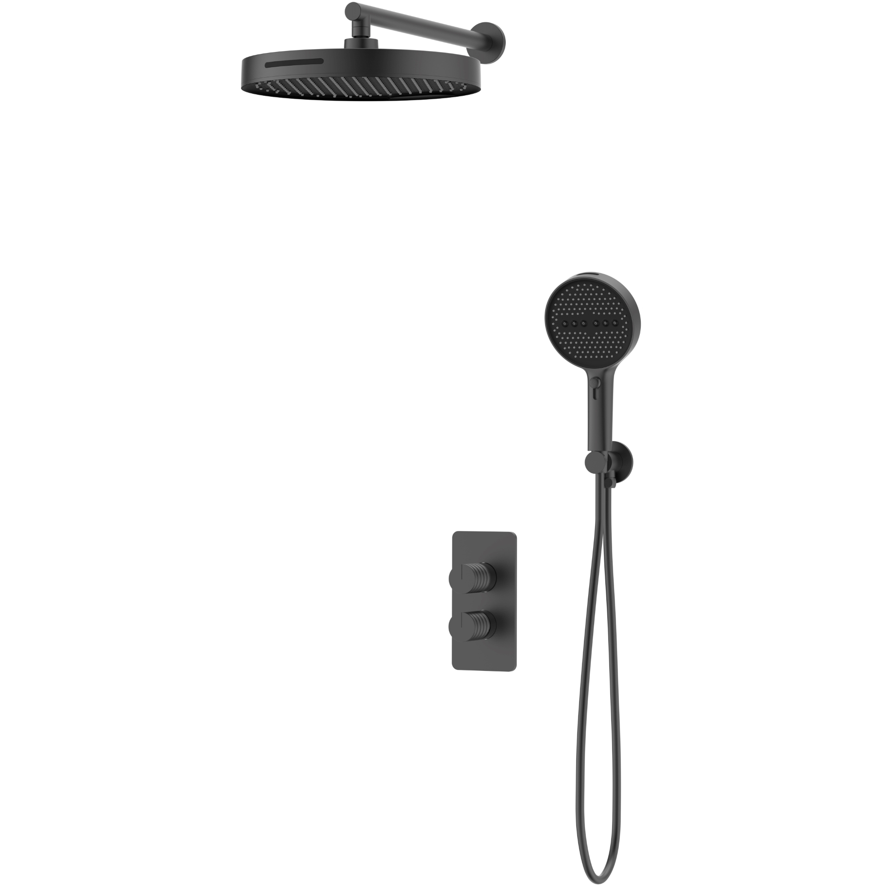 Душевая система встраиваемого монтажа. Материал: латунь. Керамический картридж. Круглый верхний душ 300 мм, 2 потока. Ручной душ 2 функции.